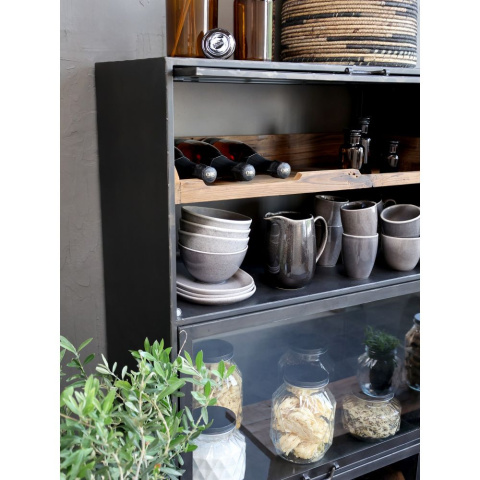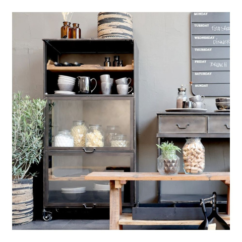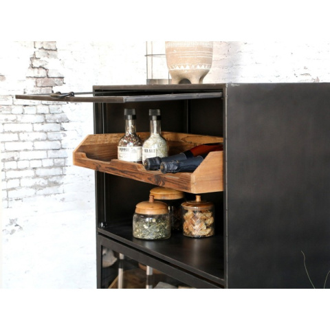 Witryna posiada drewniane tace, umiejscowione za przeszklonymi frontami. Mebel stworzony do wysmakowanych wnętrz loftowych i industrialnych. Swój wyjątkowy wygląd zawdzięcza połączeniu metalu, drewna i szkła. Witryna jest niezwykle funkcjonalna i daje wiele możliwości aranżacyjnych. Sprawdzi się szczególnie w kuchni lub jadalni, ale może być również komodą łazienkową lub miejscem na dekoracje w salonie.