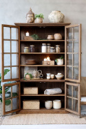 Mebel idealny do przestronnej jadalni, kuchni lub salonu. Ze względu na swój uniwersalny design odnajdzie się w wielu aranżacjach. Będzie się pięknie prezentował w stylizacji country, vintage, a także skandynawskiej. Witryna podzielona jest na dwie części — górną i dolną, i obydwie mają zamontowane pojemne półki. Idealnie sprawdzi się jako mebel na szkło, porcelanę i inne naczynia. Może być również ekspozytorem w klimatycznym sklepie czy butiku. Ten wyjątkowy, przeszklony kredens polecamy łączyć z produktami takimi jak: rustykalny stół do jadalni, drewniana komoda czy metalowa lampa postarzana.