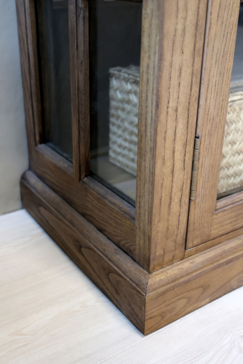 Naturalne meble drewniane do salonu — duża przeszklona witryna drewniana.
