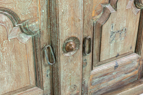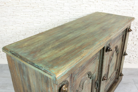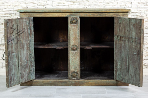 Zielona, przecierana komoda drewniana, wykonana ręcznie w Indiach z teku i starych, odzyskanych drzwi. Posiada duży schowek z półką. Jest niezwykle oryginalna, a zarazem funkcjonalna. Ciężki front ozdobiono dużymi, dekoracyjnymi okuciami. Mebel jest masywny i stabilny. Z pewnością posłuży przez długie lata i nie wyjdzie z mody. Polecamy do wnętrz orientalnych, kolonialnych i country. Mebel sprawdzi się w każdym pomieszczeniu.