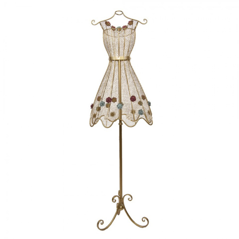 Manekin wykonany z metalu w złotym kolorze, ozdobiony kolorowymi kwiatami. Idealny jako ozdoba jasnego, romantycznego wnętrza. Idealnie wpasuje się w stylizację prowansalską, retro lub vintage. Polecamy do domów, kawiarni, butików czy stylowych pracowni. Można również zaaranżować go jako podporę dla roślin pnących.
