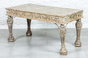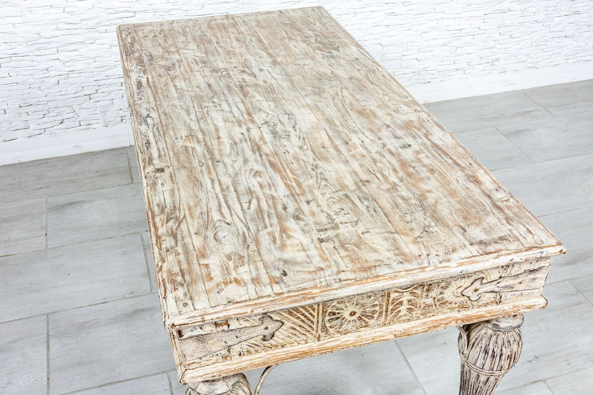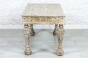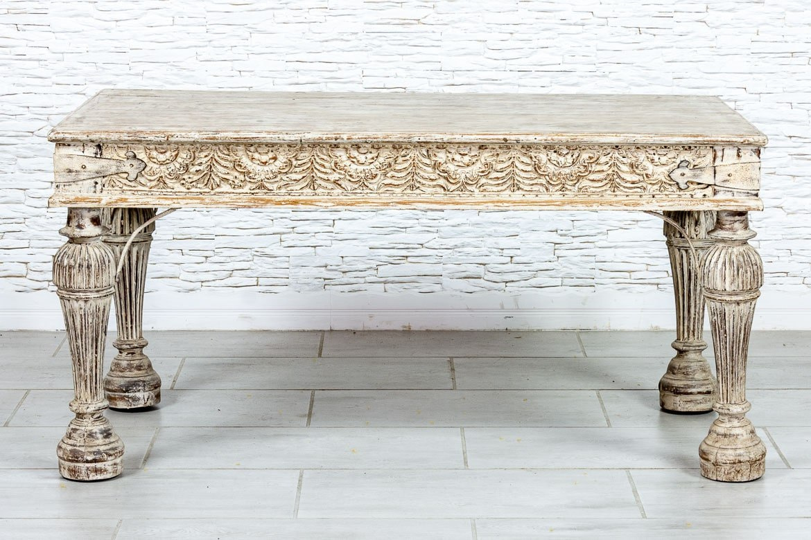 Stara, masywna ława indyjska w antycznym stylu na grubych, strojnych nogach. Mebel wykonany z drewna tekowego, bielony i przecierany. Wysoki rant blatu wyrzeźbiono we florystyczny wzór i dodatkowo wykończono żelaznymi kątownikami w stylu rustykalnym. Całość prezentuje się niezwykle oryginalnie i z pewnością wprowadzi do wnętrza wyjątkowy klimat. Ława idealna jako stół kawowy, sprawdzi się także przy planszówkach w większym gronie. Polecamy do wnętrz orientalnych, eklektycznych i vintage.