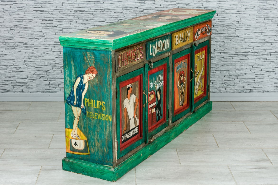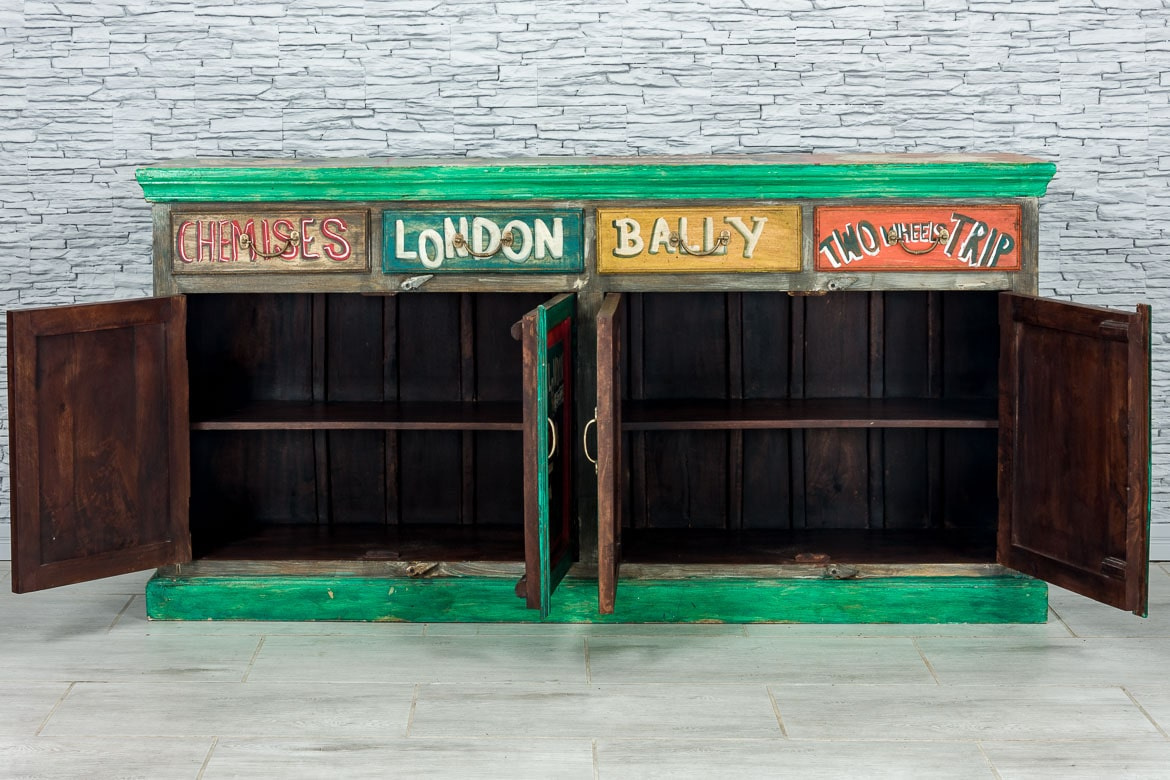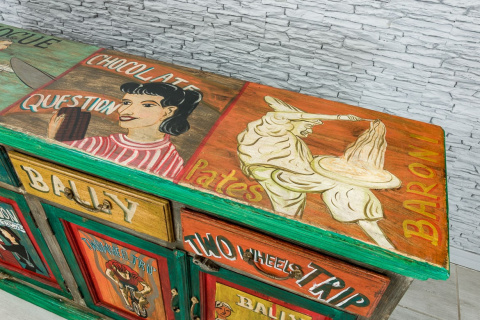 Duża, kolorowa komoda drewniana, ozdobiona komiksowymi rysunkami w stylu retro i angielskimi napisami. Komodę wykonano w całości z litego drewna mango. Mebel wybarwiono na różne kolory i przetarto. Komoda łączy w sobie niezwykły styl i funkcjonalność. Zaprojektowana tak, by można było umieścić ją w każdym pomieszczeniu. Posiada cztery szufladki i dwa duże schowki. Będzie piękną dekoracją orientalnego lub artystycznego wnętrza. Dobrze zestawiona sprawdzi się także w innych, nietuzinkowych aranżacjach. Polecamy do przestronnych wnętrz.