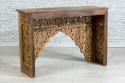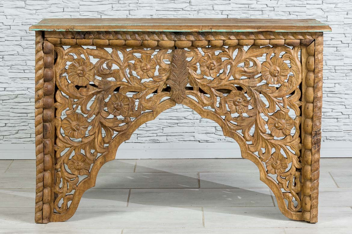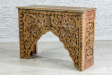 Ażurowa konsola indyjska rzeźbiona w kwiaty, wykonana z recyklingowego drewna tekowego.