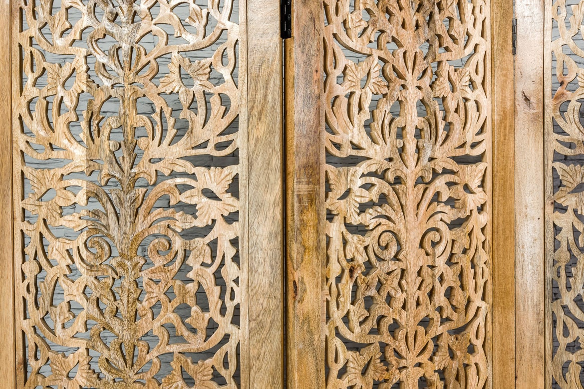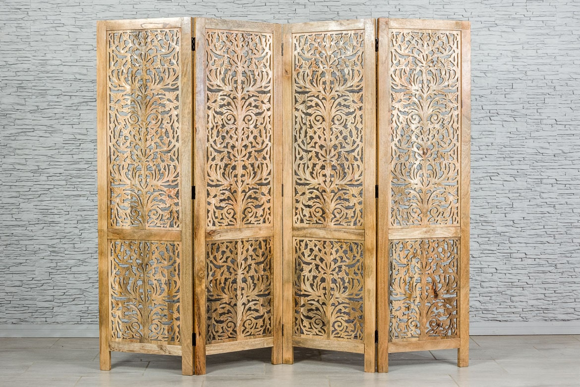Duży, ażurowy parawan indyjski wykonany z drewna mango. Parawan został ręcznie wyrzeźbiony w piękny, gęsty wzór. Utrzymany w typowo orientalnym stylu. Naturalny odcień drewna, wspaniale komponuje się z ażurowym wzorem. Parawan posiada cztery skrzydła. Jest wysoki i rozłożysty.