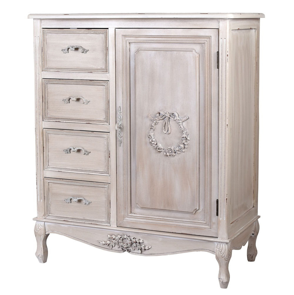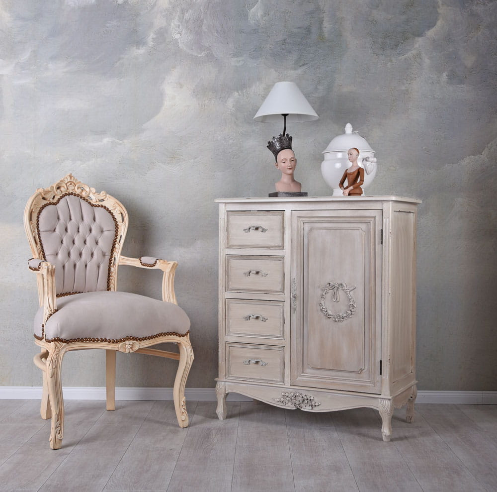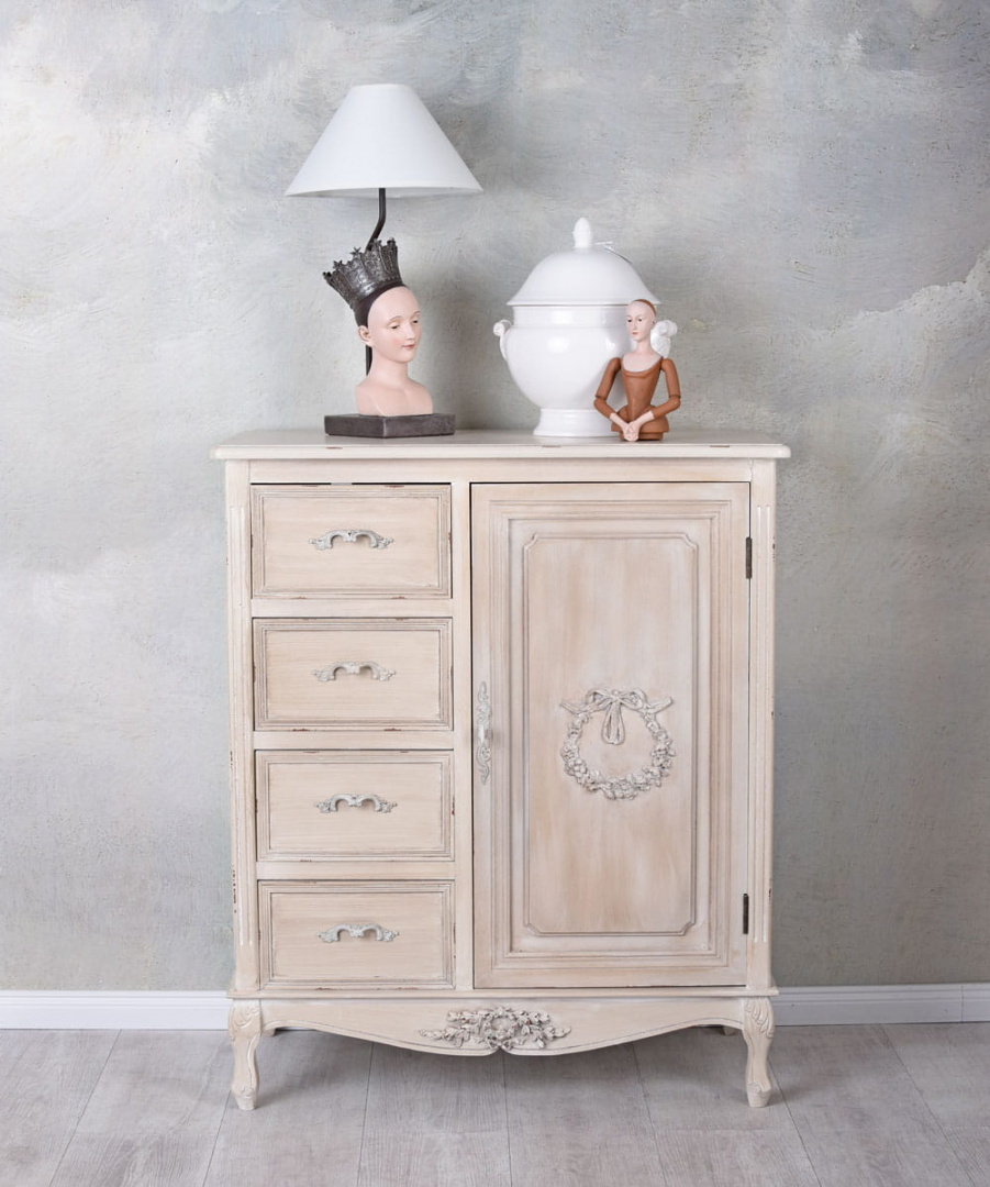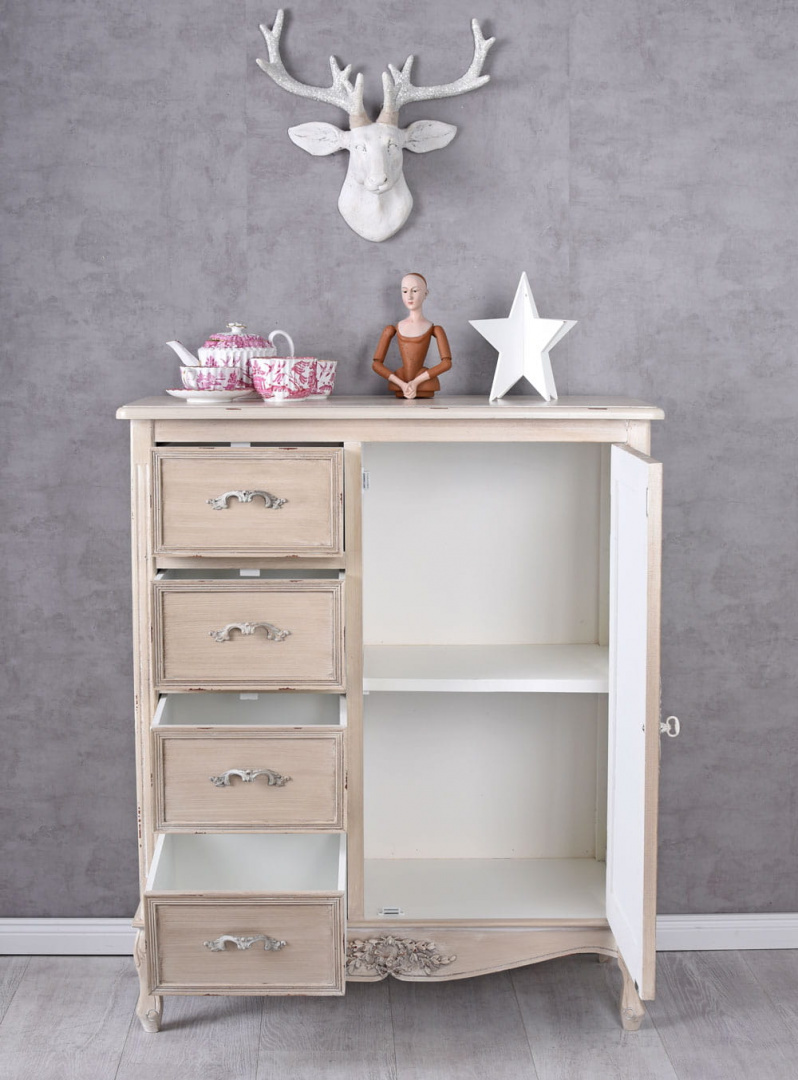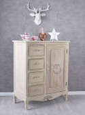 Mebel wygląda jak ze starego dworku lub pałacyku. Antyczny odcień beżu i przetarcia idealnie komponują się z eleganckim ornamentami i archaicznym kształtem mebla. Stylizowane na stare uchwyty, dopełniają wysmakowaną całość i dodają komodzie niezwykłego uroku. Komoda posiada schowek z półką i cztery szuflady. Komoda sprawdzi się w każdym pomieszczeniu, szczególnie w aranżacjach vintage, shabby i prowansalskich.