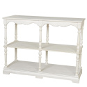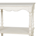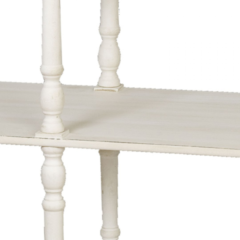 Bielona konsola w stylu prowansalskim marki Clayre & Eef. Konsola wykonana w całości z litego drewna. Mebel o bardzo klasycznym, ponadczasowym kształcie. Prosta forma połączona ze stylowymi, toczonymi tralkami i przetarciami. Całość prezentuje się niezwykle lekko i z pewnością oczaruje każde jasne wnętrze. Konsola wspaniale ozdobi rustykalny przedpokój lub prowansalski salon. Ze świeżymi kwiatami lub innymi ozdobami stworzy w Twoim wnętrzu romantyczny nastrój. Konsola posiada dwie otwarte półki, na których możesz ustawić ulubione przedmioty.