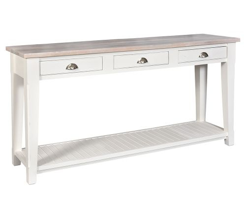 Blat konsoli wykonano z drewna mango, które pobielono i zaimpregnowano olejem. Elementy bielone charakteryzują się niejednolitą kolorystyką przenikających się szarości oraz bladego różu. Ta wyjątkowa konsola posiada trzy szuflady z ozdobnymi uchwytami, oraz dolną półkę. Ta konsola w stylu hampton przepięknie ozdobi Twój przedpokój lub salon. Możesz zaaranżować ją np. z roślinami, koszami czy oświetleniem.