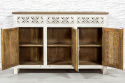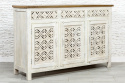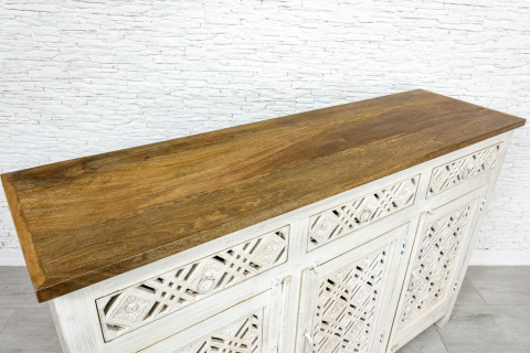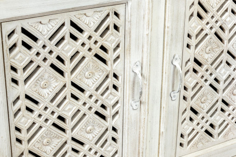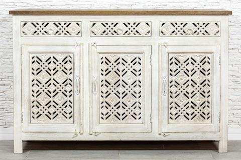 Indyjska, biała komoda ażurowa wykonana z litego drewna mango w stylu orientalnym. Mebel posiada przepiękne, rzeźbione fronty, które kryją za sobą pokaźną przestrzeń do przechowywania. Komoda ma schowki z półkami, a także trzy szuflady. Brązowy blat przepięknie komponuje się z jasną całością. Komoda zachwyca zarówno stylem jak i funkcjonalnością. Ozdobi przestronny salon w orientalnym wnętrzu lub hall w indyjskiej restauracji.