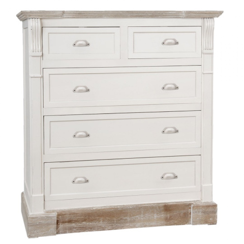 Blat i podstawę komody przetarto i wyszczotkowano dla uzyskania efektu starości. Bielone boki wykończono antycznymi dekorami co nadaje jej szyku i elegancji. Komoda posiada trzy duże i dwie mniejsze szuflady ze stylowymi uchwytami. To praktyczna ozdoba Twojej sypialni, salonu lub przedpokoju.