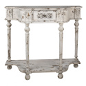 Mebel o bardzo eleganckim, dekoracyjnym kształcie, którego dostojny styl przełamują liczne przetarcia i efekt zniszczenia. Konsola wspaniale ozdobi rustykalny przedpokój lub prowansalski salon. Ze świeżymi kwiatami lub innymi ozdobami stworzy w Twoim wnętrzu klimatyczny nastrój. Sprawdzi się w stylizacjach farmhouse style decor i country chic.