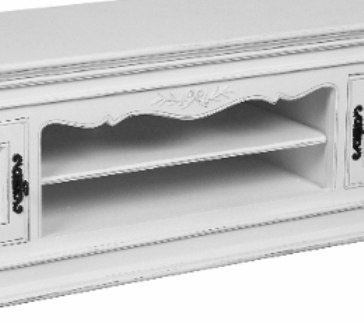 Ozdobna, drewniana szafka RTV, z serii ROMANCE od Belldeco. Wykonana z połączenia drewna sosnowego i płyty mdf. Ta biała komoda w stylu prowansalskim, to niezwykle urokliwy, a zarazem użytkowy mebel, który idealnie wpasuje się do romantycznego salonu w stylu prowansalskim, vintage lub shabby. Szafka posiada dwa schowki i dwie otwarte półki na sprzęt. Górna zwieńczona została przepięknym dekorem z florystycznym ornamentem.