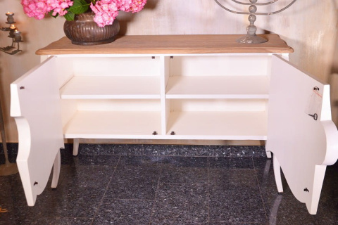Mebel sprawdzi się we wnętrzach vintage, prowansalskich, a także country chic.