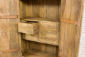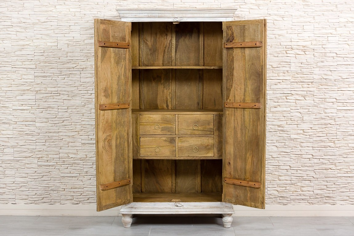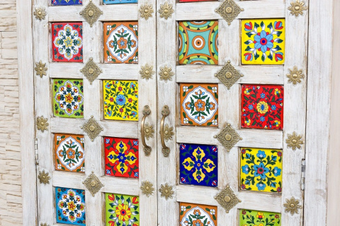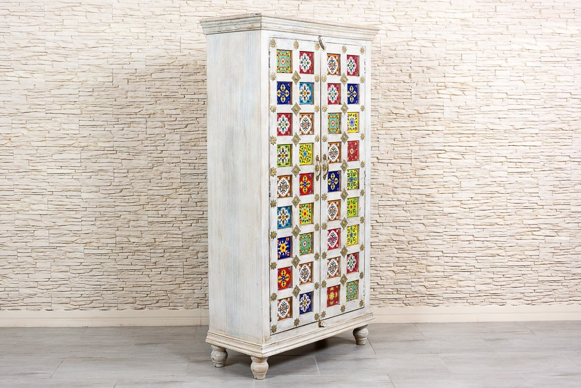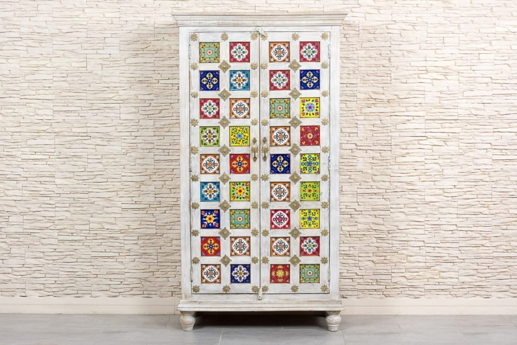 Bielona szafa indyjska z ozdobnymi frontami, na których umieszczono zjawiskowe, ceramiczne płytki w stylu orientalnym, a także mosiężne dekory. Ten mebel został wykonany ręcznie w Indiach. Do jego produkcji użyto drewna egzotycznego. Bala skorupa pięknie kontrastuje z bogatymi zdobieniami. Oprócz walorów estetycznych szafa jest również bardzo praktyczna. Posiada pojemne półki i cztery szuflady.