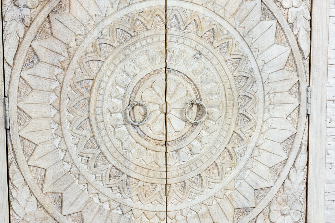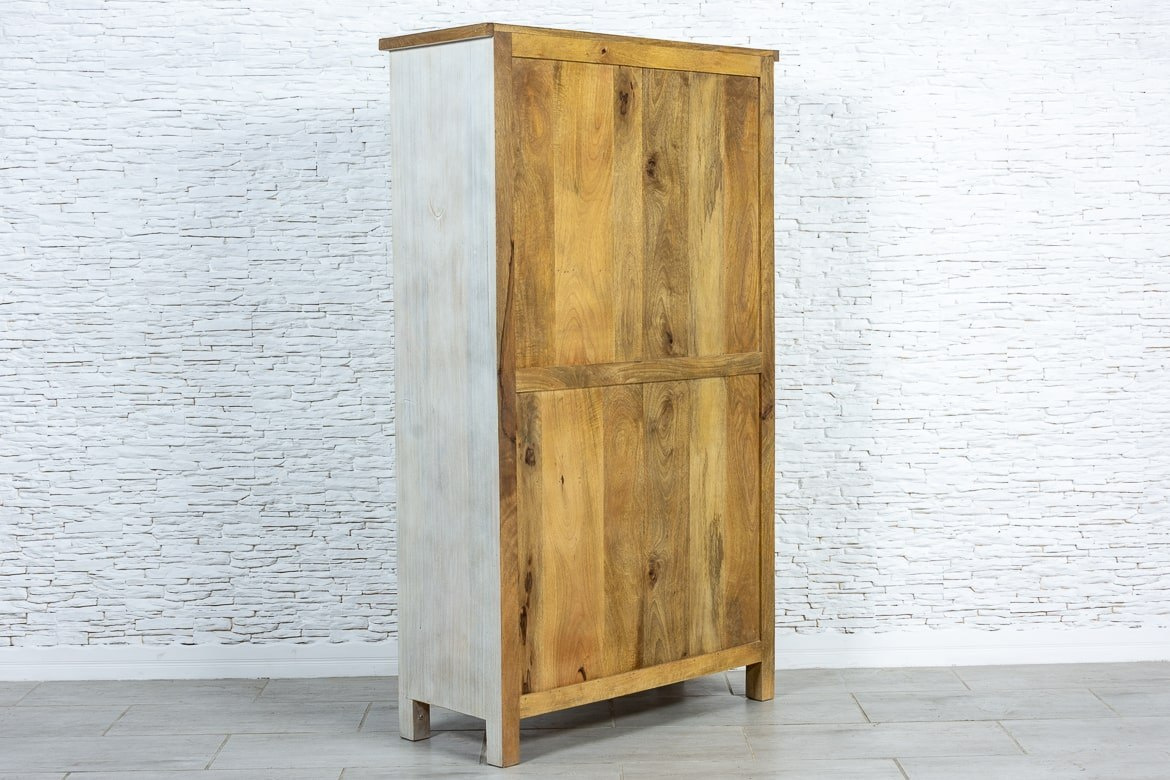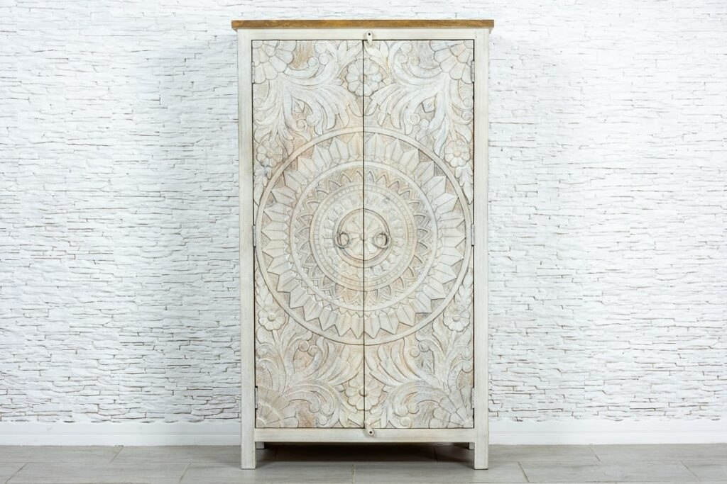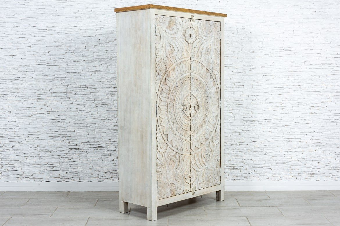 Biała, przecierana szafa indyjska wykonana z drewna mango. Ozdobne, rzeźbione fronty z mandalą połączono z przetarciami i okrągłymi uchwytami. Szafa posiada dwie wysokie półki. Mimo swojego niewielkiego wzrostu jest bardzo pojemna i praktyczna. Mebel odnajdzie się w każdym pomieszczeniu. Polecamy do przedpokoju, biura czy orientalnej łazienki.