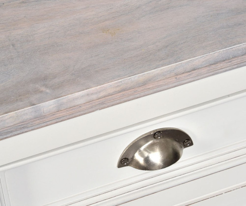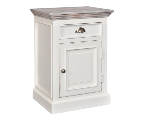 Przepiękny odcień naturalnego drewna, delikatnie bielony, połączony z antyczną bielą, to zestawienie, które pokocha każdy wielbiciel stylu prowansalskiego lub hampton. Blat szafki wykonany z drewna mango, bielony i zaimpregnowany olejem. Elementy bielone charakteryzują się niejednolitą kolorystyką przenikających się szarości oraz bladego różu. Szafka posiada szufladę i zamykaną szafkę z ozdobnym uchwytem.