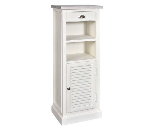 Przepiękny odcień naturalnego drewna połączony z antyczną bielą, to ponadczasowe zestawienie, które pokocha każdy wielbiciel stylu prowansalskiego lub hampton. Komoda posiada szufladę z ozdobnym uchwytem, zamykaną szafkę, której drzwiczki wyglądem przypominają drewniane żaluzje okienne oraz otwarte półki.