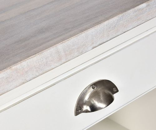 Może być zaaranżowana na wiele sposobów. Ta urocza, biała komódka z naturalnym drewnianym bielonym blatem, to mebel, który odnajdzie się właściwie w każdym pomieszczeniu. Może być ustawiona niezależnie lub użyta jako uzupełnienie niewielkiej przestrzeni. Elementy bielone charakteryzują się niejednolitą kolorystyką przenikających się szarości oraz bladego różu.
