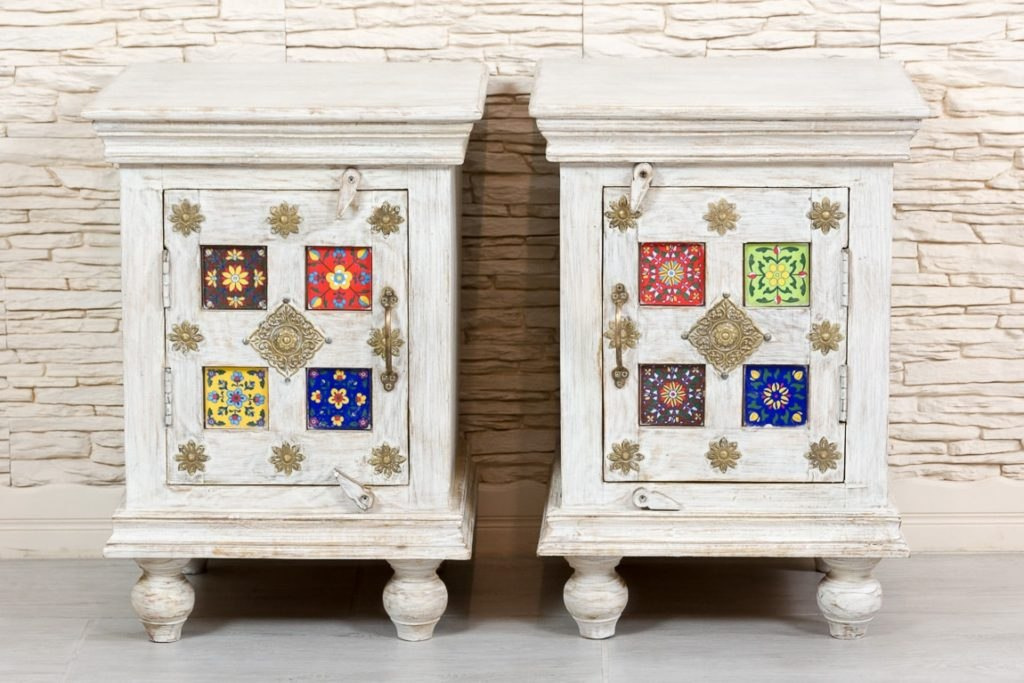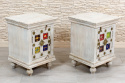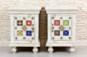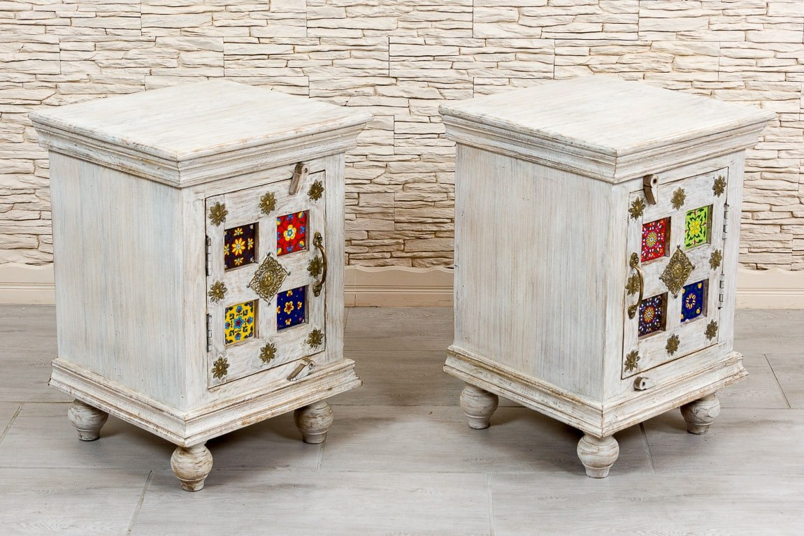 Zestaw pięknych, indyjskich szafek nocnych z ozdobnymi frontami. Te orientalne stoliki nocne łączą w sobie ponadczasowy styl, jakość wykonania i orientalną duszę. Szafki wykonane ręcznie w Indiach z egzotycznego drewna mango. Fronty ozdobione ceramicznymi płytkami i mosiężnymi dekorami. Cena za dwie sztuki. Możliwość zakupu tylko w komplecie