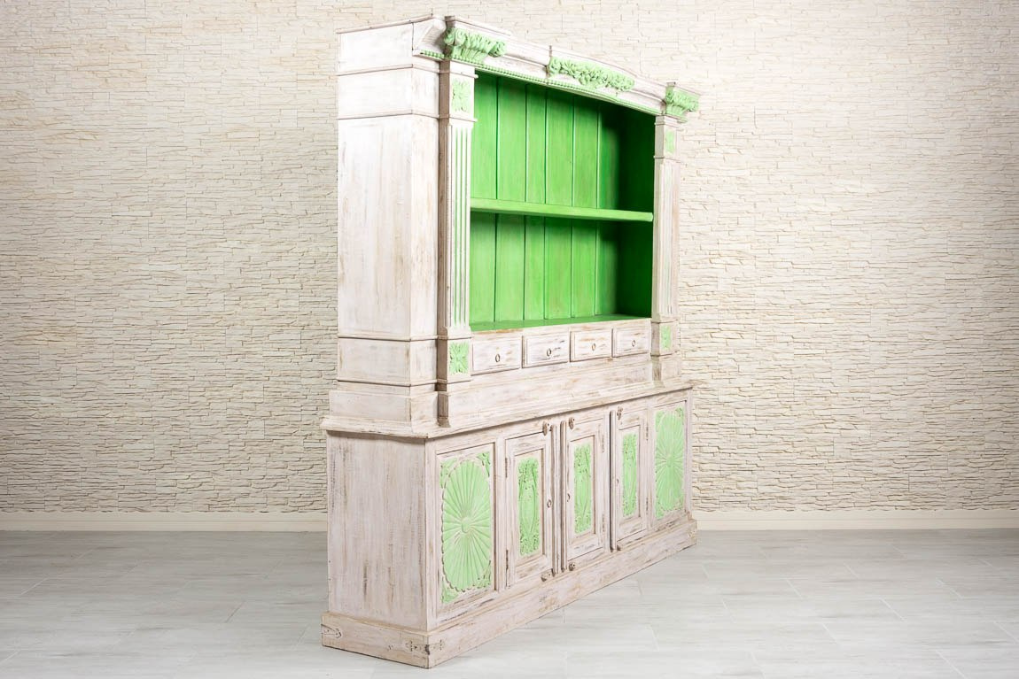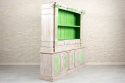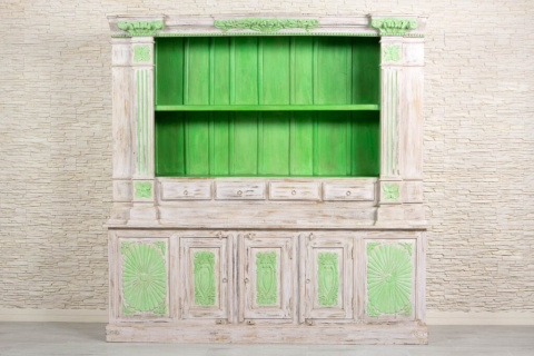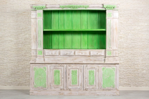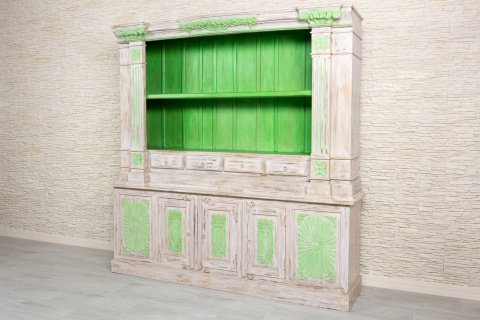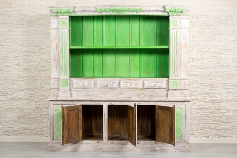 Duży, dwuczęściowy kredens indyjski wykonany z litego drewna mango. Kredens bielony i przecierany. Antyczne, zdobne wykończenie w połączeniu z intensywną limonką i jasnym tłem tworzy nietuzinkową całość. Ten niezwykle oryginalny mebel z pewnością zainteresuje konesera stylu orientalnego. Typowy dla Indii przepych łączy się z klasyką i funkcjonalnością. Kredens jest bardzo pojemny. Posiada dużą przestrzeń otwartą, zamykane obszerne schowki bez półek i cztery małe szufladki. Z pewnością zaczaruje orientalne wnętrze i wprowadzi do niego zapach prawdziwych Indii.
