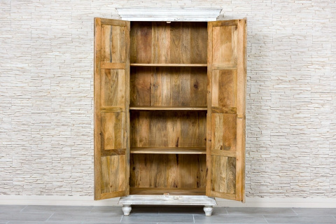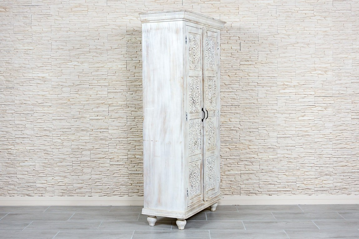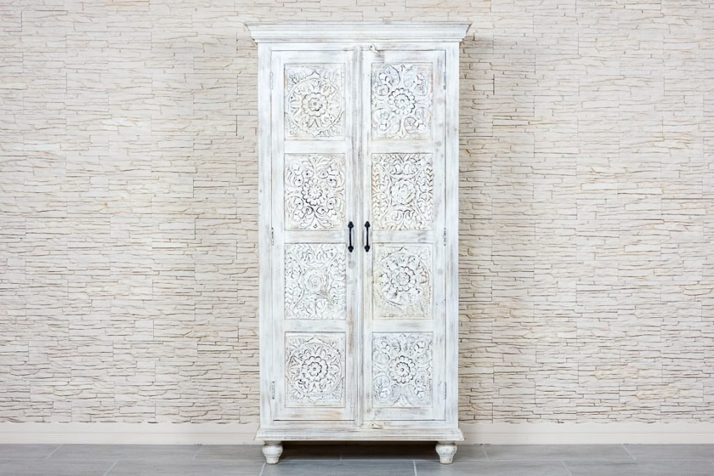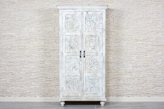 Orientalna, postarzana biała szafa dwudrzwiowa z ozdobnymi frontami. Ten mebel został wykonany ręcznie przez indyjskich rzemieślników z wysokiej jakości surowca jakim jest drewno mango. Wewnątrz znajdują się pojemne półki. Szafa bielona i przecierana specjalną techniką. Drzwi ozdobione rzeźbieniami, kształtem przypominającymi mandale i kwiaty. Ozdobne uchwyty nadają meblowi charakteru vintage. Mebel odnajdzie się w każdym pomieszczeniu.