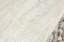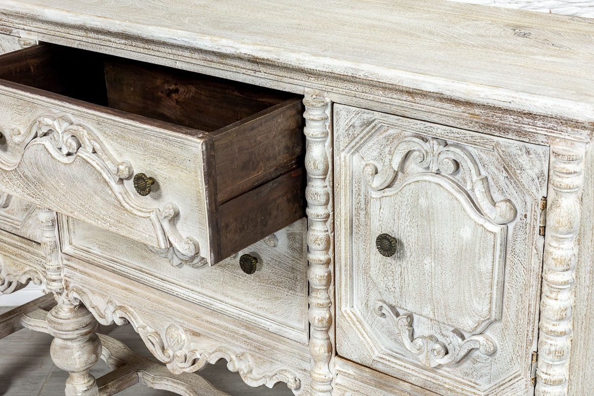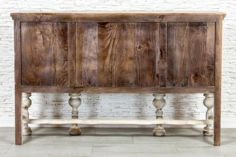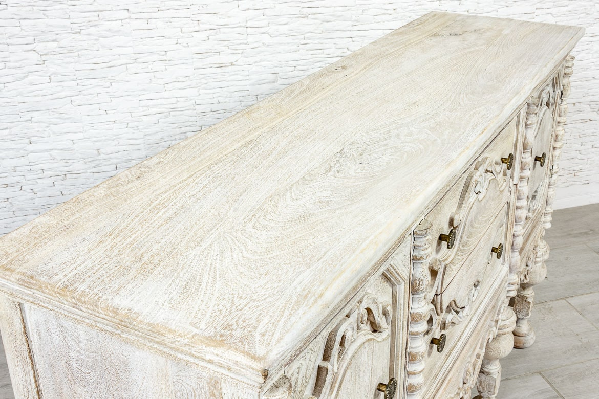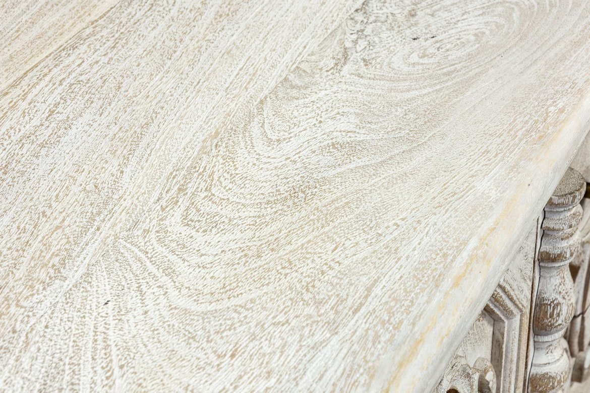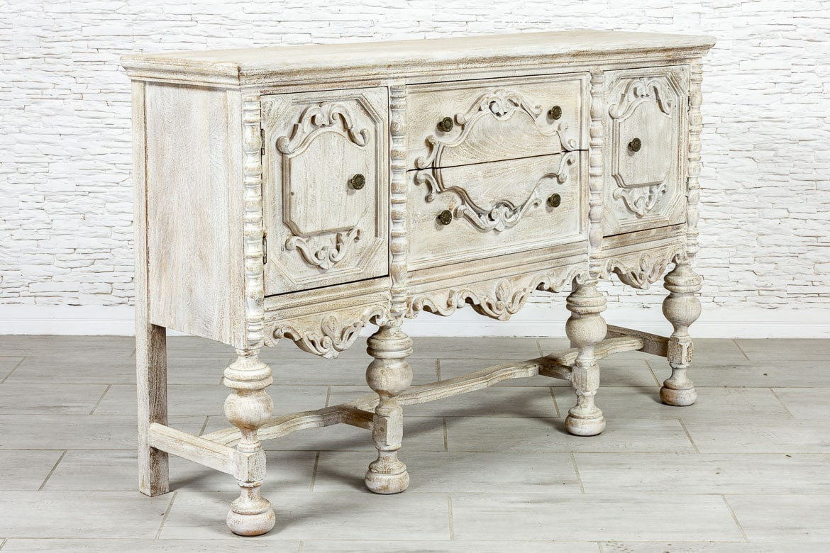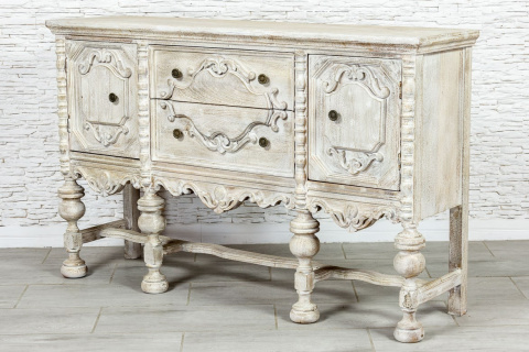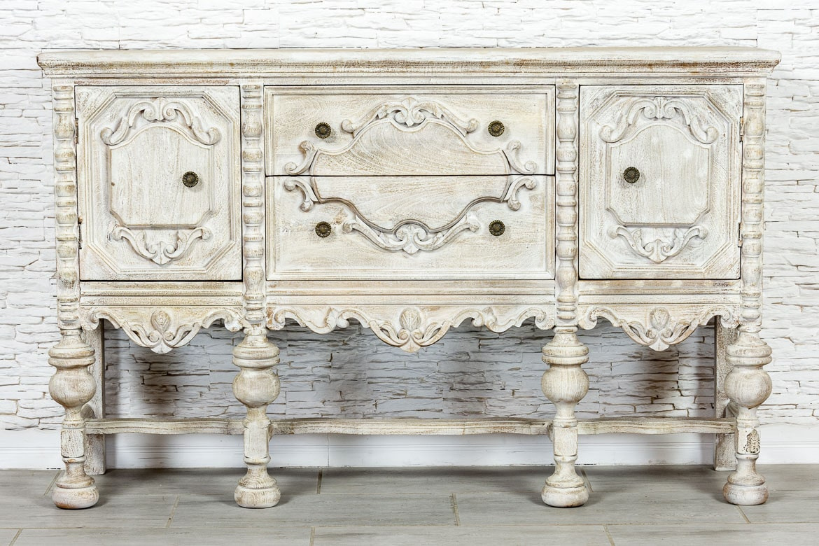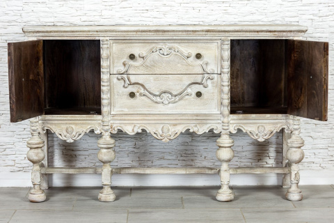 Indyjska, bielona komoda / konsola wykonana z litego drewna mango i przecierana. Mebel posiada przepiękne, rzeźbione fronty, które kryją za sobą pokaźną przestrzeń do przechowywania,. Ma dwa spore schowki, a także dwie szuflady różnej wielkości. Komodę osadzono na strojnej, masywnej podstawie, która nawiązuje do stylu z dawnych lat. Zachwyca zarówno stylem jak i funkcjonalnością. Ozdobi przestronny salon w orientalnym wnętrzu lub hall w indyjskiej restauracji.