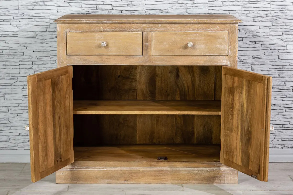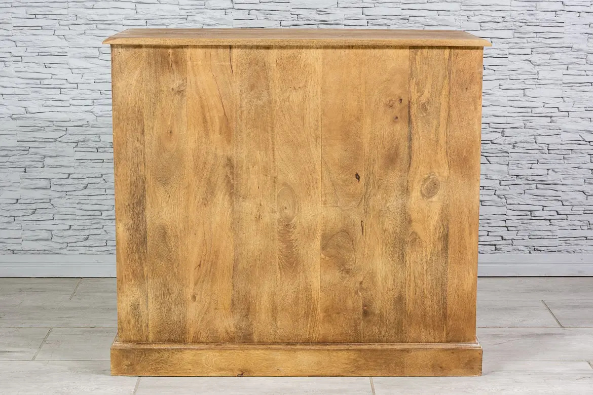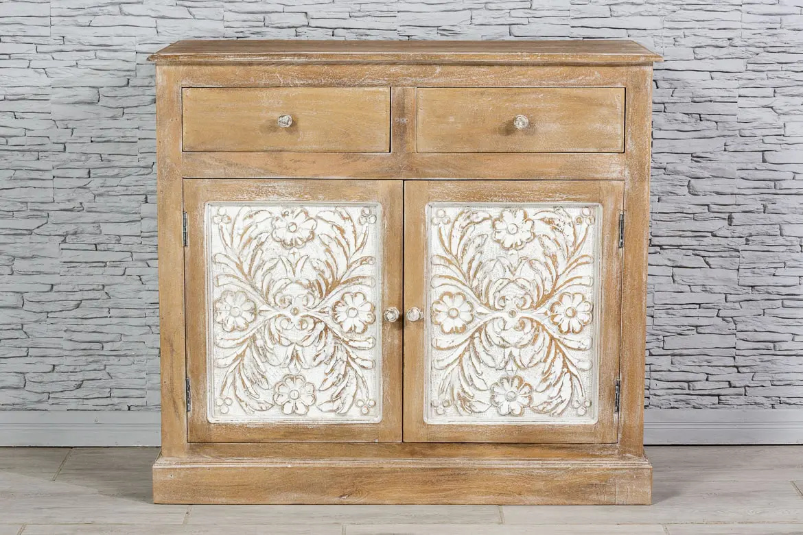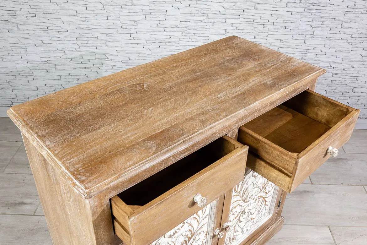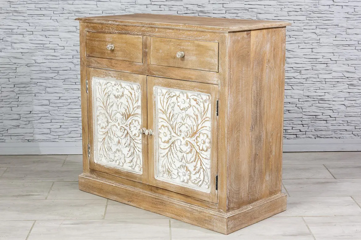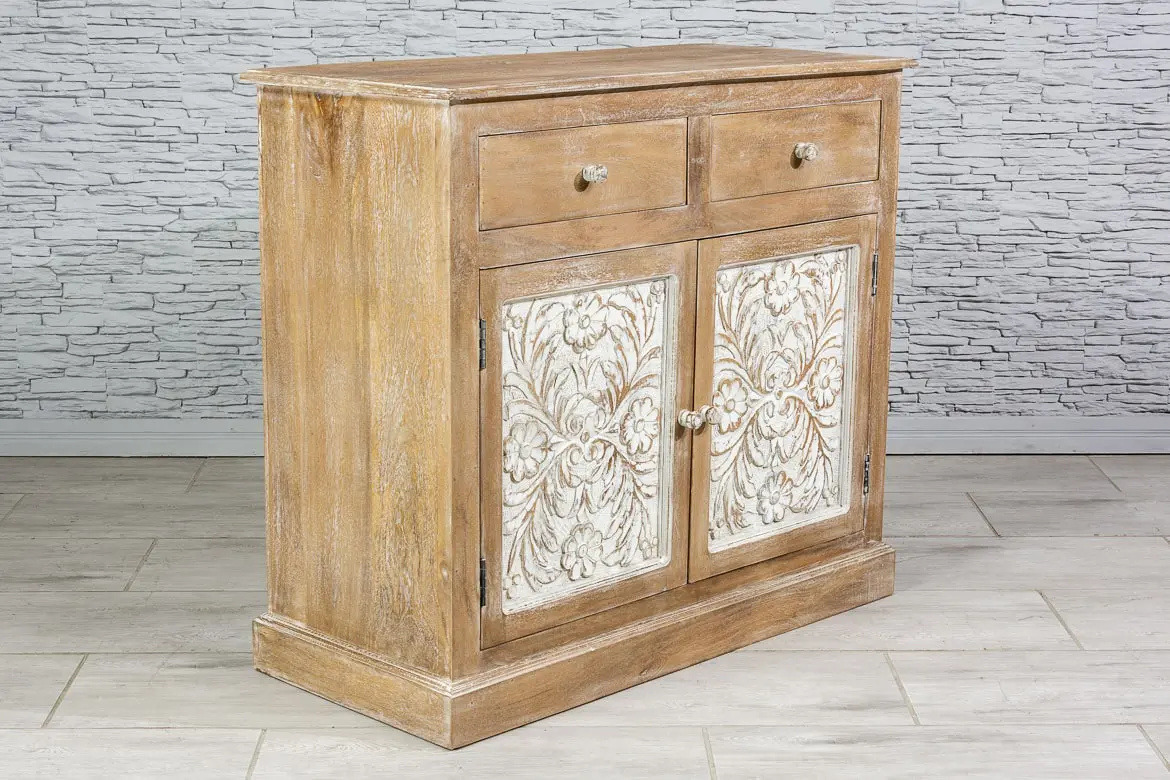 Wykonana z drewna mango i postarzona dla uzyskania rustykalnego efektu. Przepiękne, rzeźbione drzwiczki i szuflady, wykończono bielonymi uchwytami, co pięknie kontrastuje z naturalnym brązem. Mebel ponadczasowy stylistycznie i bardzo uniwersalny użytkowo.