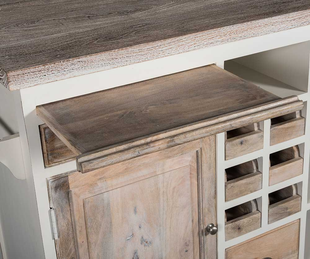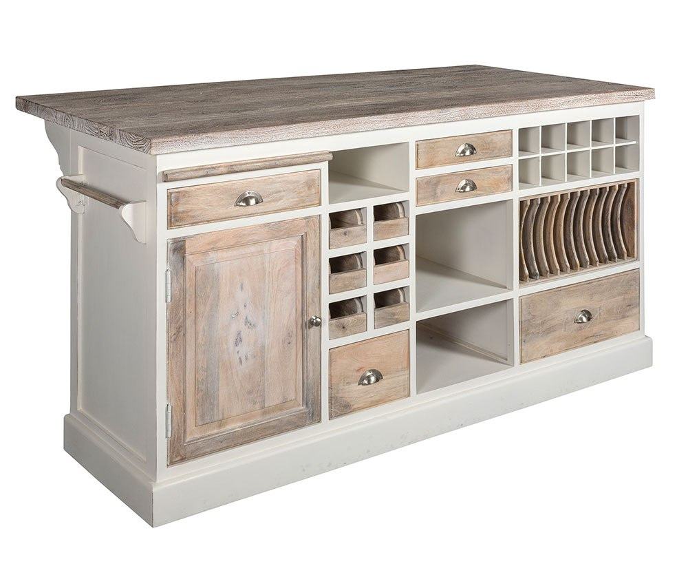 Przepiękna wyspa kuchenna w stylu hampton, wykonana z litego drewna egzotycznego i płyty mdf. Ten niezwykły mebel Z kolekcji Bristol White od Belldeco został przemyślany w każdym calu. Zachwyca wyrafinowanym stylem i funkcjonalnością. Idealnie sprawdzi się w romantycznej kuchni lub prowansalskiej restauracji. Wyspa posiada pięć szuflad różnej wielkości, pojemny schowek zamykany drzwiczkami, trzy otwarte półki, przegródki na wino, organizer na przyprawy bądź inne drobiazgi, a także miejsce na talerze. Z boku przewidziano uchwyt na ściereczki. Od strony roboczej blat jest wysunięty tak aby zwiększyć komfort pracy.