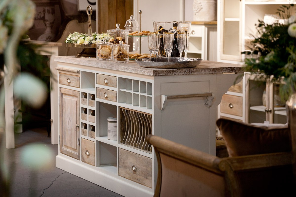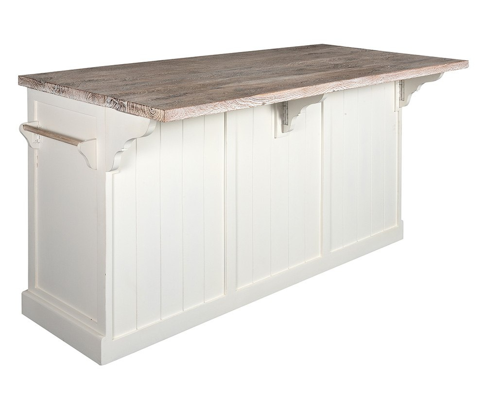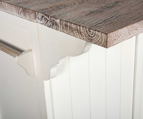 Wyspa zachwyca każdym detalem. Rustykalne uchwyty wspaniale komponują się ze złamaną bielą i naturalnym drewnem. Klasyczny kształt sprawia, że jest to mebel ponadczasowy i uniwersalny.