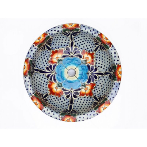 Okrągła umywalka wpuszczana z Meksyku. Wszystkie umywalki są malowane ręcznie przez meksykańskiego artystę, więc każda umywalka stanowi unikalne dzieło sztuki użytkowej. Piękna i niesamowicie barwna, oparta na wzornictwie meksykańskim, w intensywnych ciepłych kolorach.