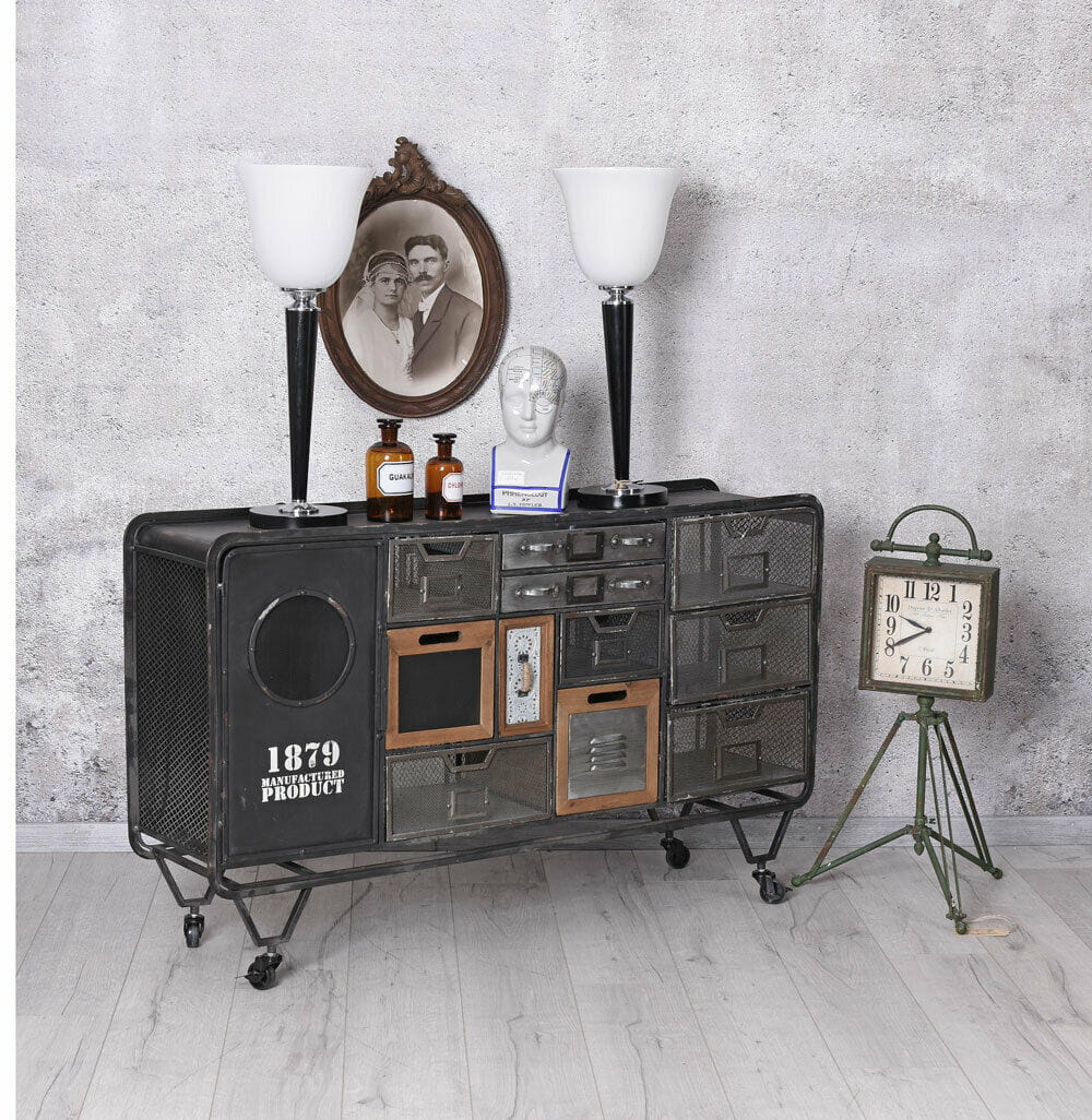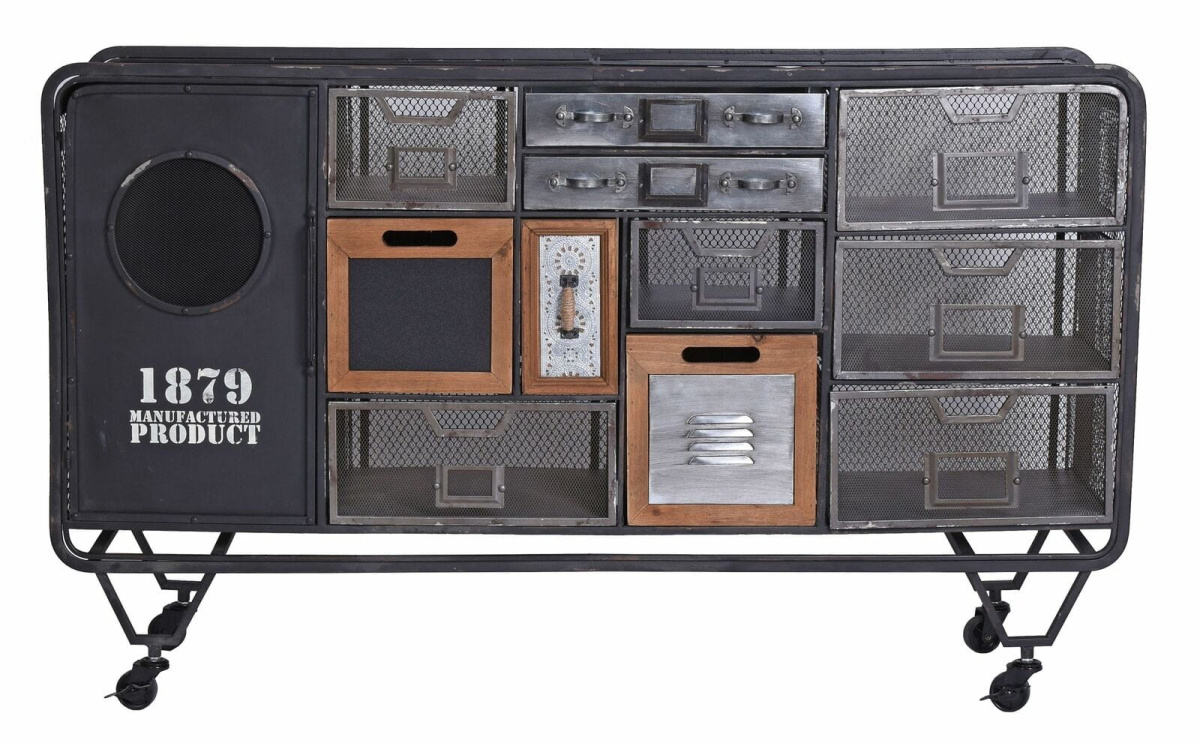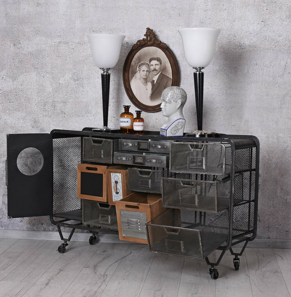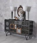 Szeroka, industrialna komoda na kółkach, wykonana z metalu z dbałością o każdy szczegół.