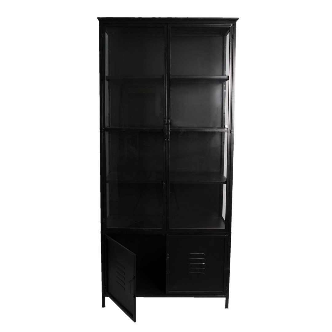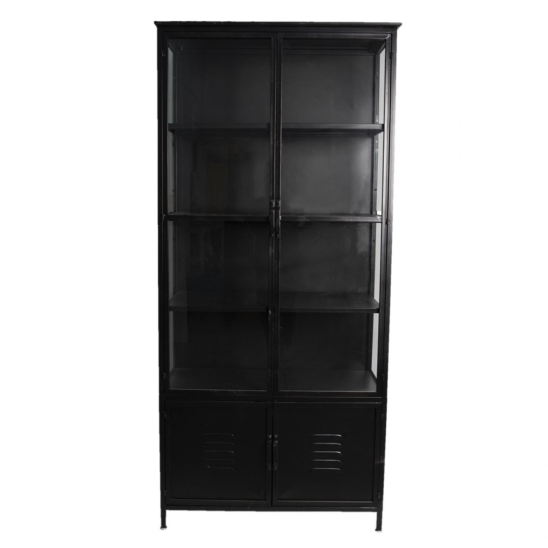 Wysoka, czarna witryna na nóżkach w stylu industrialnym.