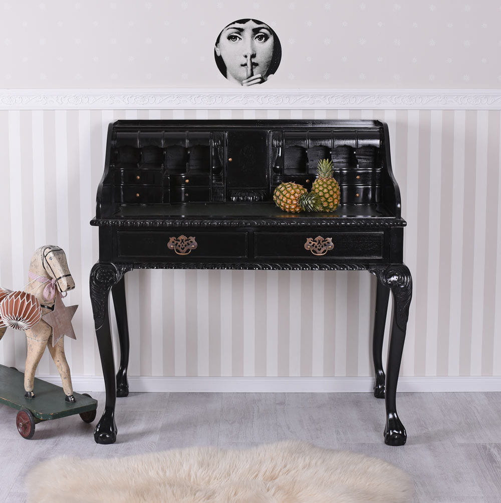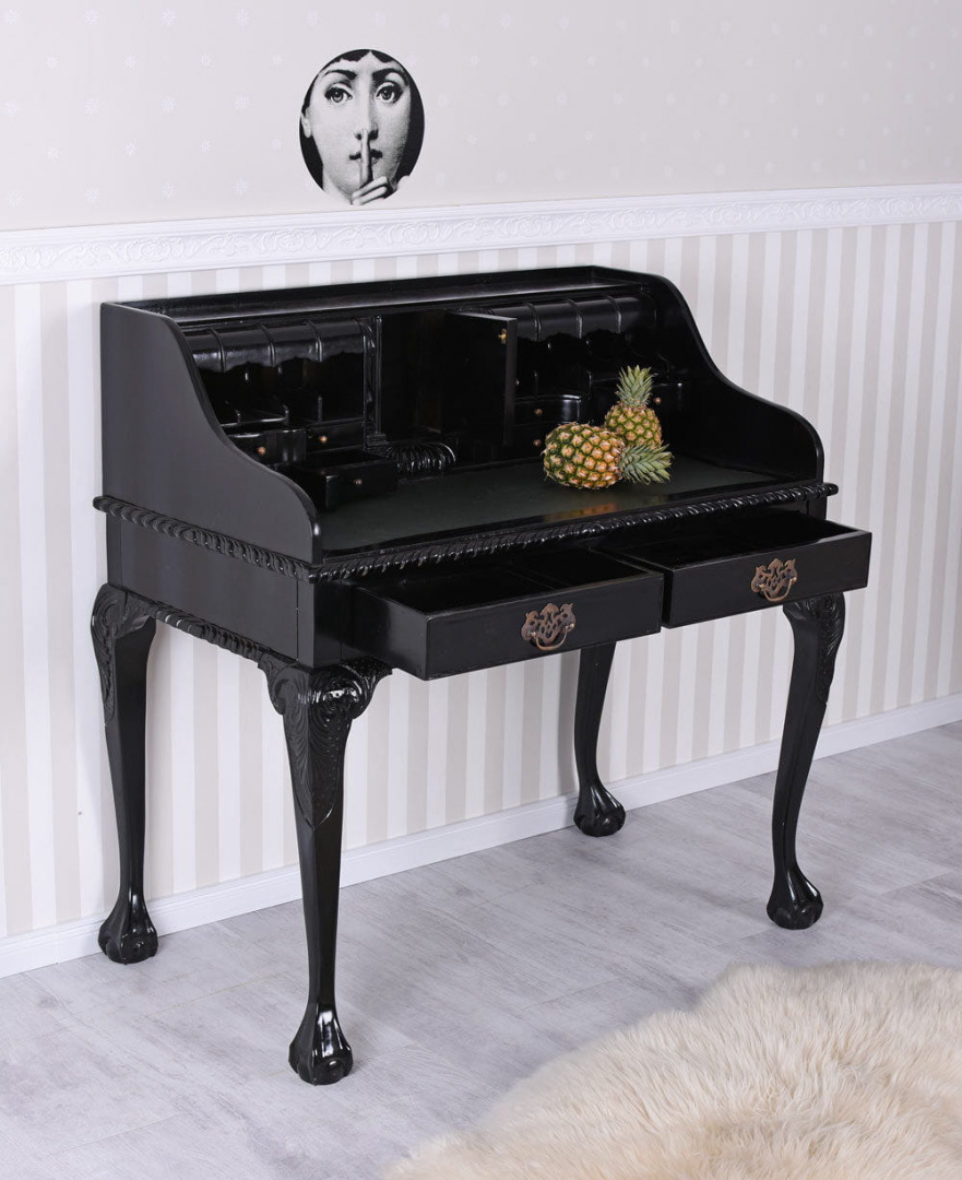 Czarny sekretarzyk na antycznych nogach, stylizowany na mebel z dawnych lat.