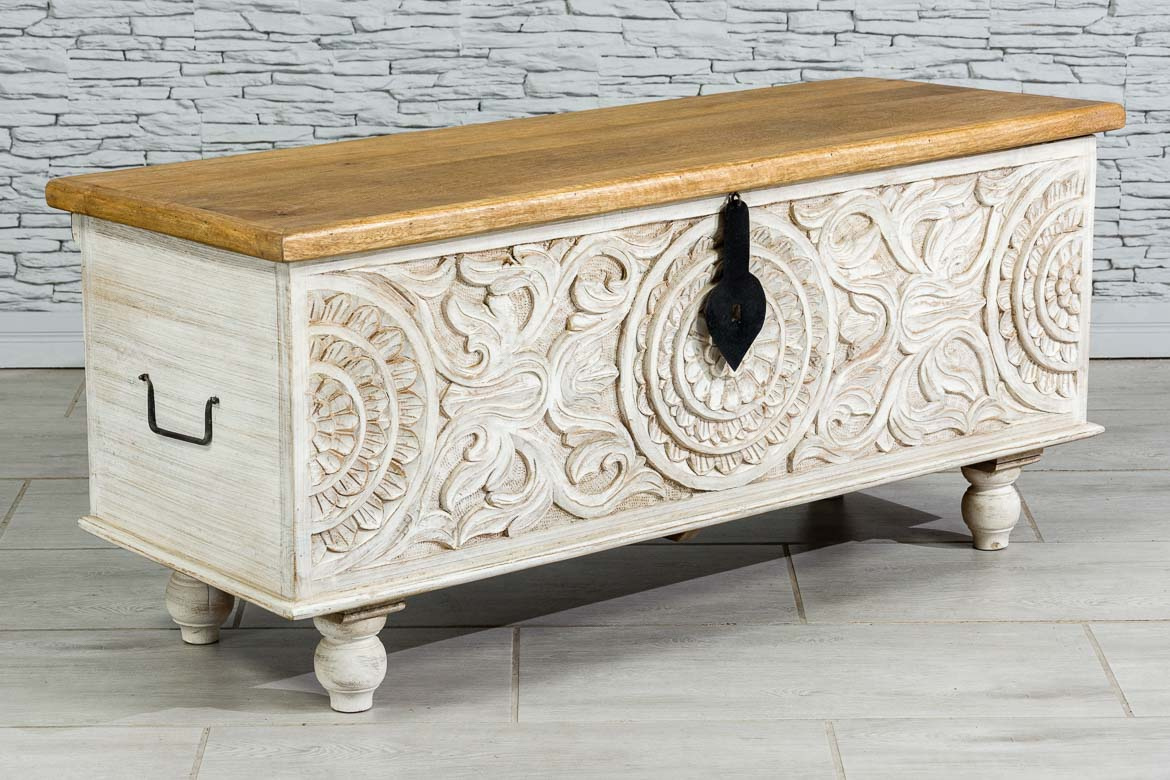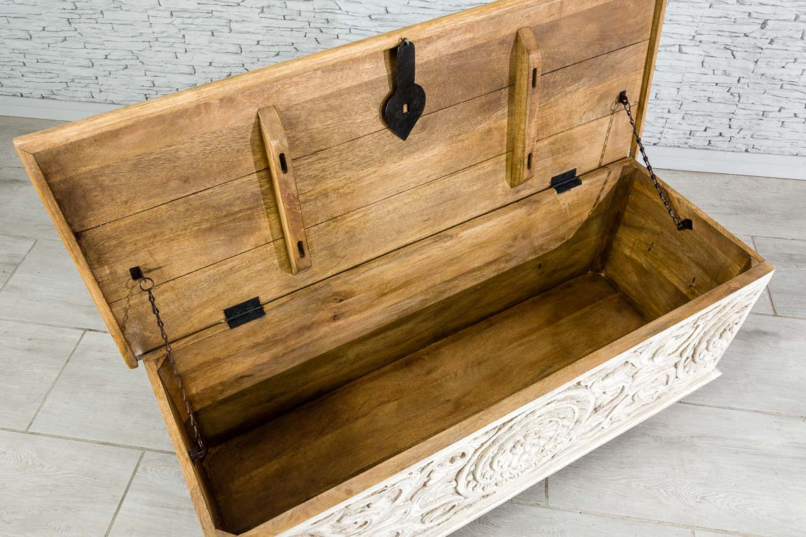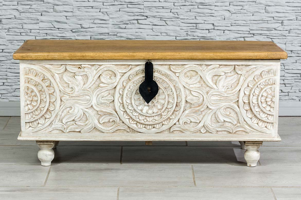 Jej front bogato wyrzeźbiono w duży wzór florystyczny i zjawiskowe mandale. Całość bielona oraz lekko przecierana, z wyłączeniem klapy w odcieniu naturalnego brązu. Kufer może służyć jako siedzisko i schowek. Jest jednocześnie wyjątkową ozdobą wnętrza. Ta piękna skrzynia, posiada masywną, solidną konstrukcję. Jest więc trwała i odporna na zniszczenia. Wykonana ręcznie w Indiach.