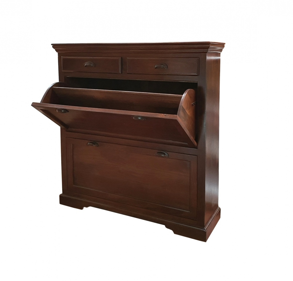 Szafka wykonana w Indiach z wysokiej jakości litego drewna akacji indyjskiej w kolorze ciepłego brązu. Drewno, z którego została zrobiona, posiada widoczną strukturę słoi, co dodaje jej niepowtarzalnego charakteru. Szafka posiada dwie niewielkie szuflady oraz dwa uchylne schowki na buty, z których każdy posiada przegrodę na całej długości.