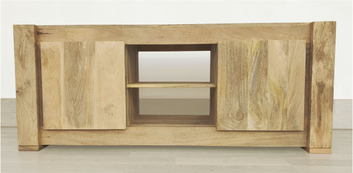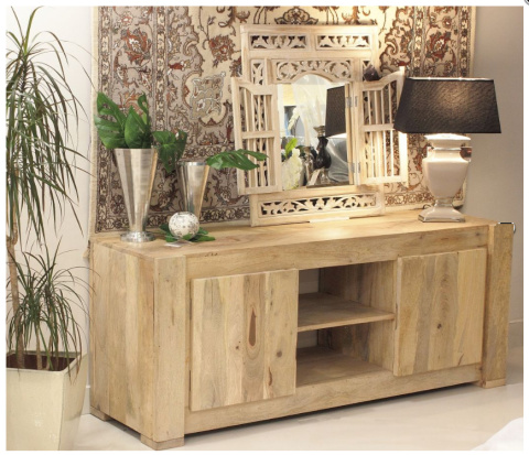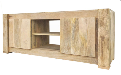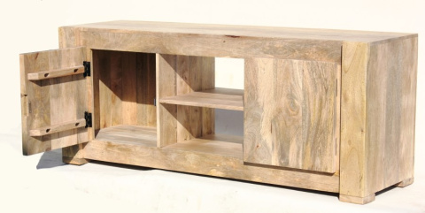 Komoda wykonana w Indiach, z grubej i twardej deski mangowca w jego naturalnym odcieniu. Mebel został zabezpieczony matowym lakierem wodnym. Jasna barwa tego szlachetnego surowca, z wyeksponowanymi słojami, zachwyca i cieszy oko. Mebel o prostej formie, funkcjonalny i ponadczasowy. Posiada dwie zamykane szafki z półkami oraz otwartą półkę na sprzęt RTV.