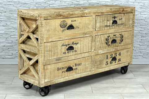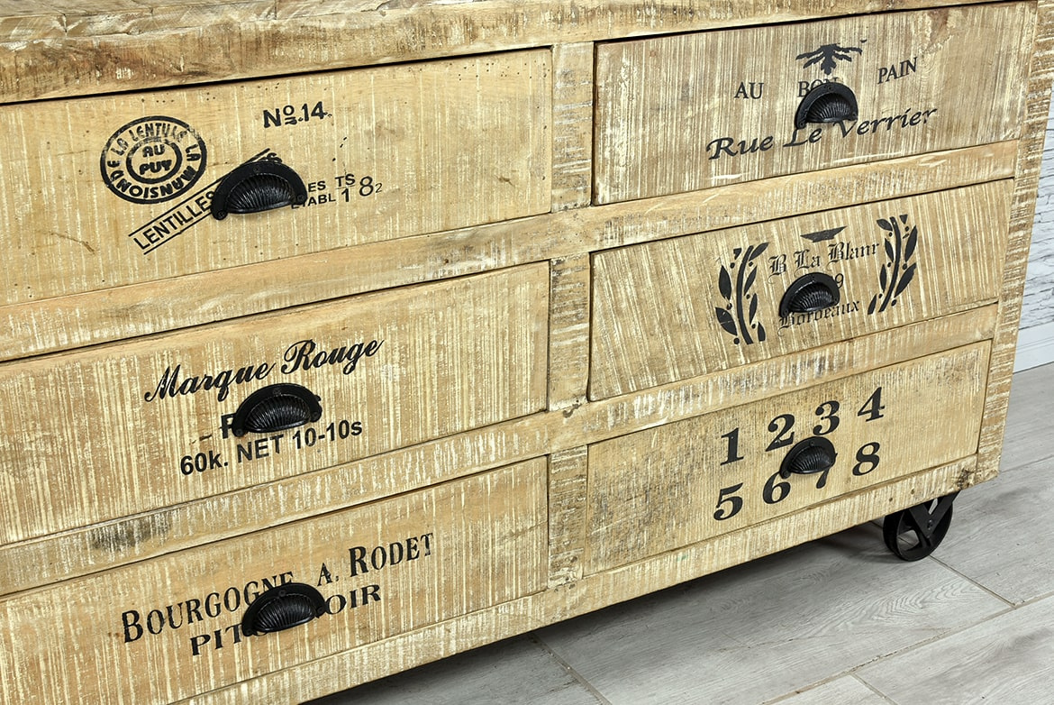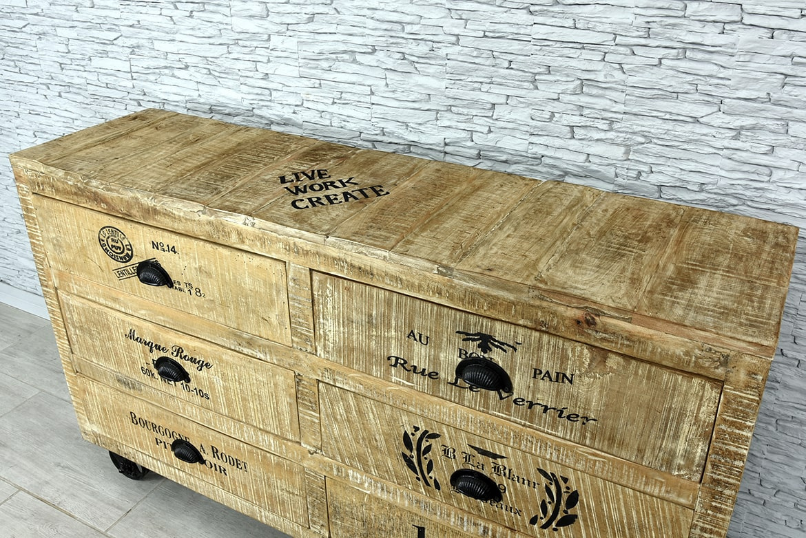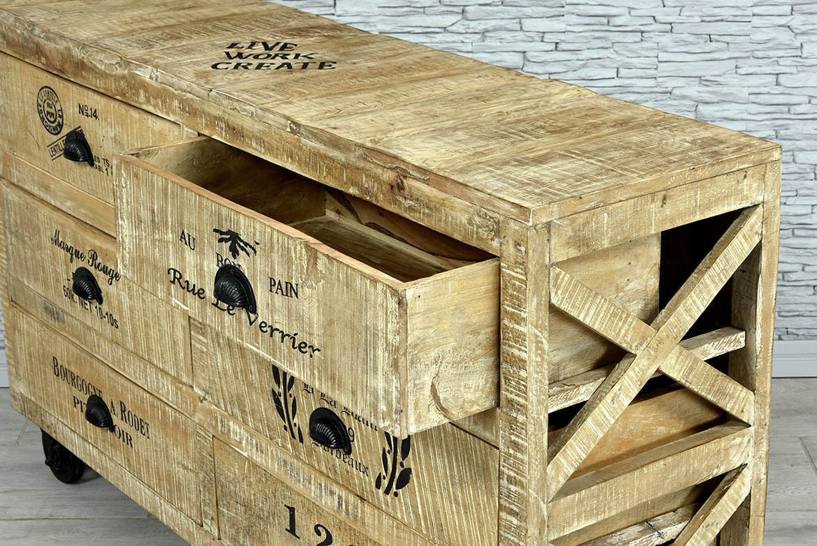 Loftowa komoda indyjska z czarnymi stemplami, wykonana ręcznie przez stolarzy - artystów w małej pracowni. Mebel zrobiono z litego, szczotkowanego drewna mango w naturalnym odcieniu z lekkim bieleniem. Na fronty i blat naniesiono czarne stemple z napisami i grafikami w stylu vintage, a całość uzupełniono rustykalnymi uchwytami. Komoda posiada sześć szuflad i ciężkie, industrialne kółka, dzięki którym możesz ją łatwo przesuwać.