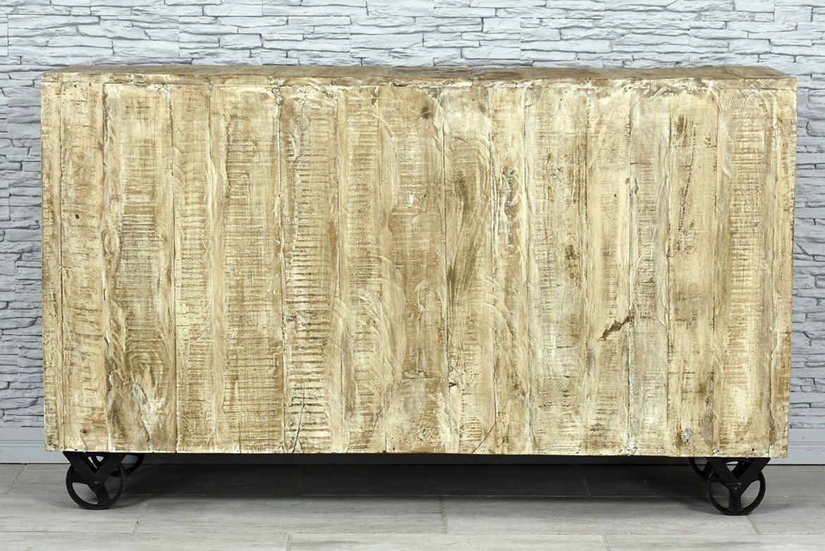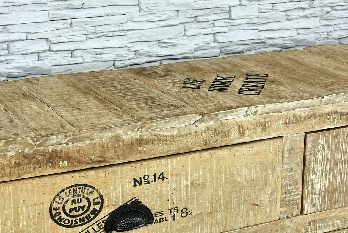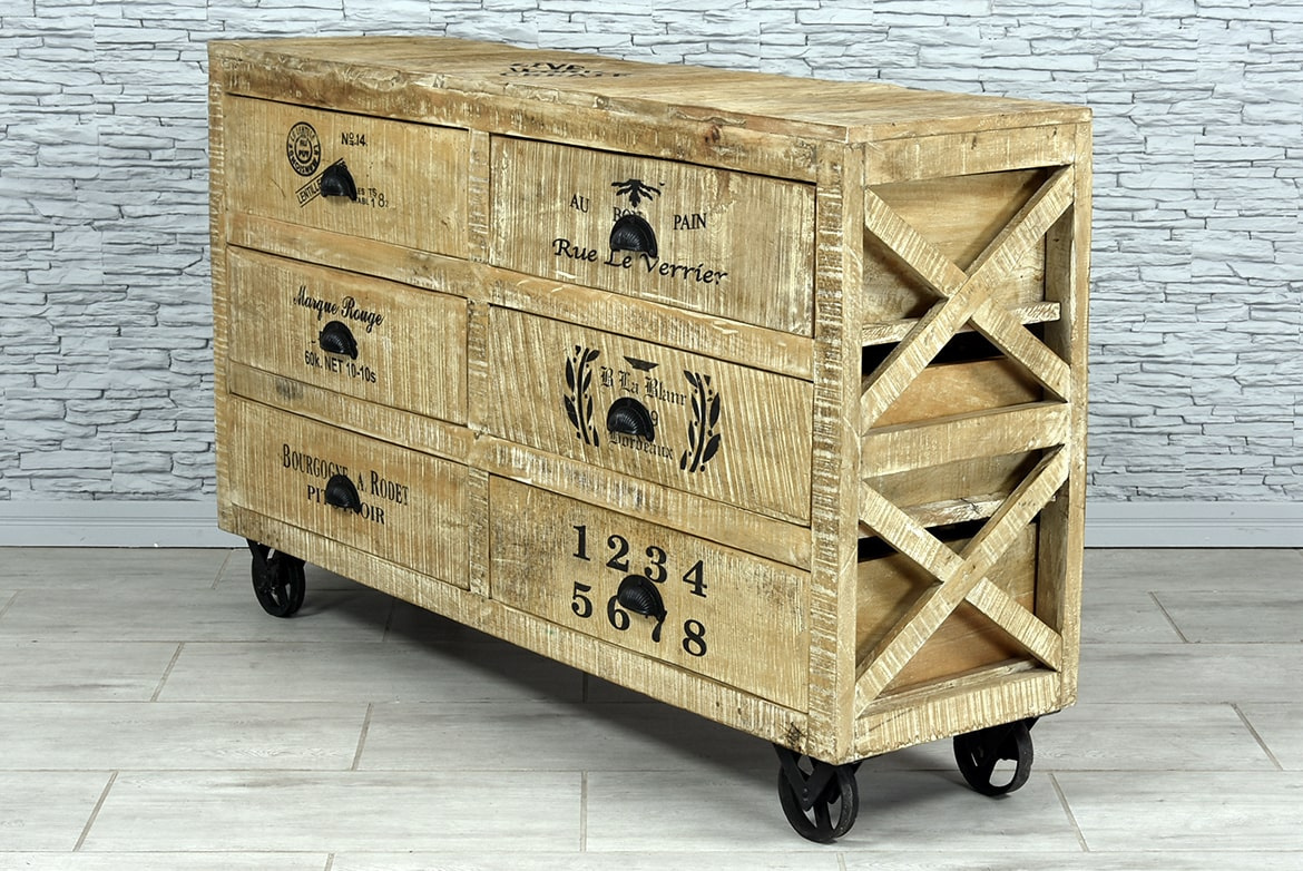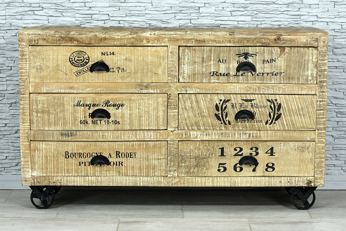 Loftowa komoda indyjska z czarnymi stemplami, wykonana ręcznie przez stolarzy - artystów w małej pracowni. Mebel zrobiono z litego, szczotkowanego drewna mango w naturalnym odcieniu z lekkim bieleniem. Na fronty i blat naniesiono czarne stemple z napisami i grafikami w stylu vintage, a całość uzupełniono rustykalnymi uchwytami. Komoda posiada sześć szuflad i ciężkie, industrialne kółka, dzięki którym możesz ją łatwo przesuwać.