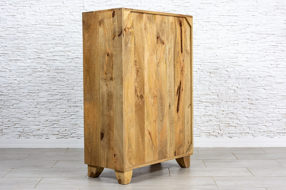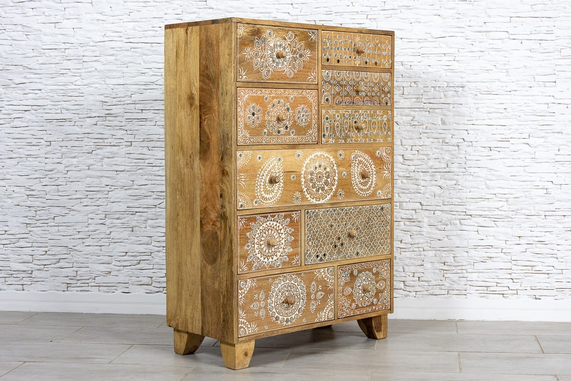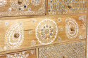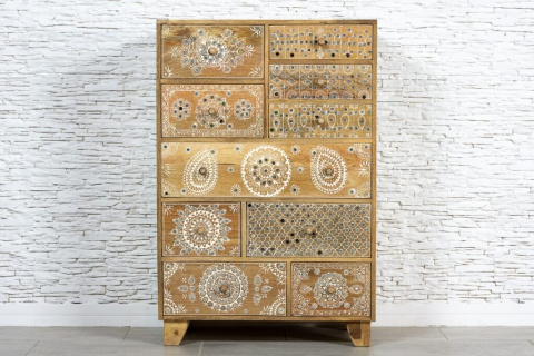 Mebel wykonany z litego drewna mango w naturalnym odcieniu. Komoda posiada aż dziesięć szuflad różnej wielkości, z których każda została ozdobiona orientalnym wzorem namalowanym wypukłą farbą, a także małymi, okrągłymi lusterkami, które przepięknie odbijają światło.