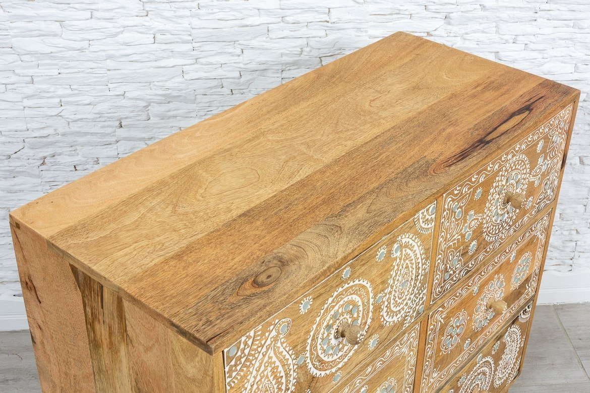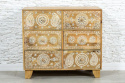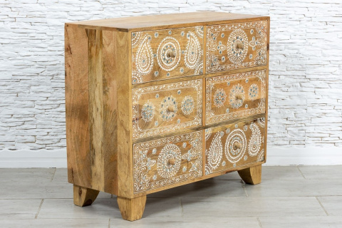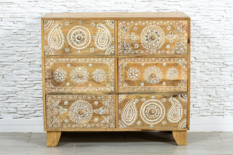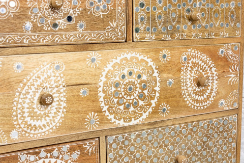 Przepiękna, unikalna komoda indyjska w stylu orientalnym. Mebel wykonany z litego drewna mango w naturalnym odcieniu. Komoda posiada aż sześć pojemnych szuflad, z których każda została ozdobiona orientalnym wzorem namalowanym wypukłą farbą, a także małymi, okrągłymi lusterkami, które przepięknie odbijają światło.