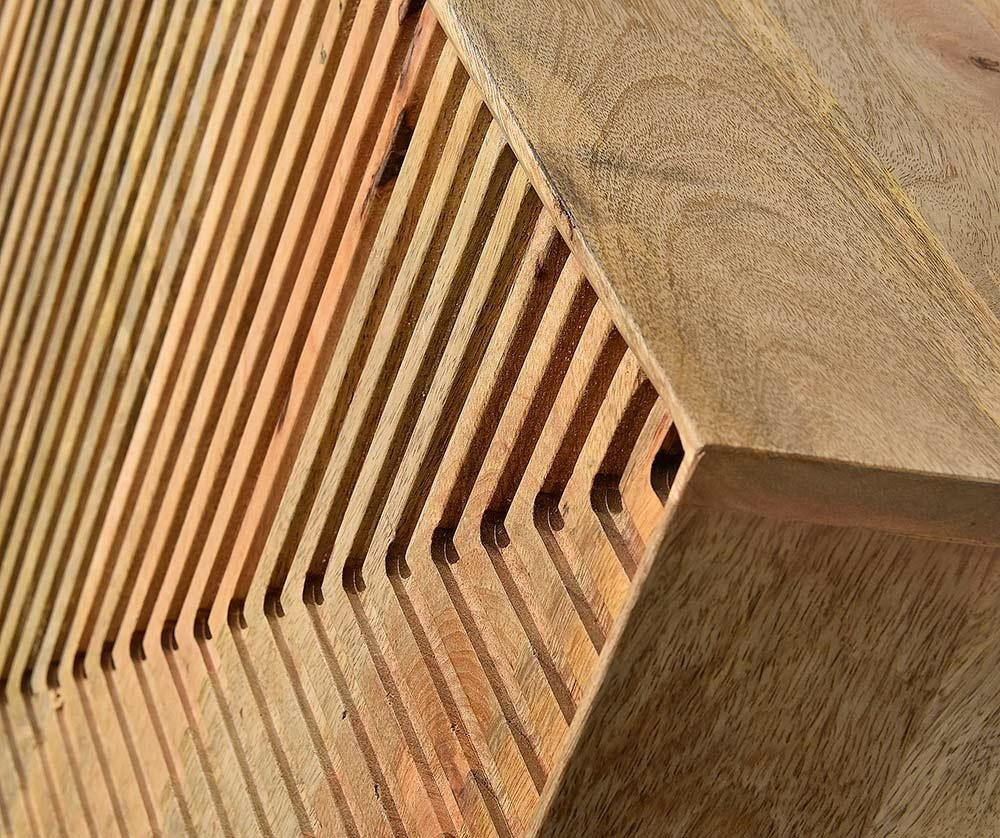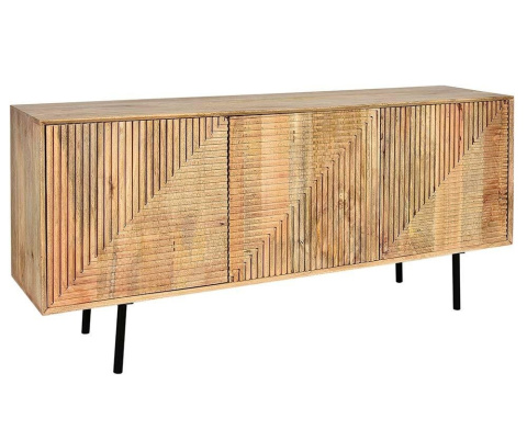 Nowoczesna komoda drewniana z serii MODERN LIGHT od Belldeco. Mebel stylizowany na lata 60-te. Potężna, minimalistyczna bryła z pojemnymi schowkami, urozmaicona została wypukłą, geometryczną fakturą na frontach. Charakterystyczne, smukłe nóżki nadają jej lekkości.