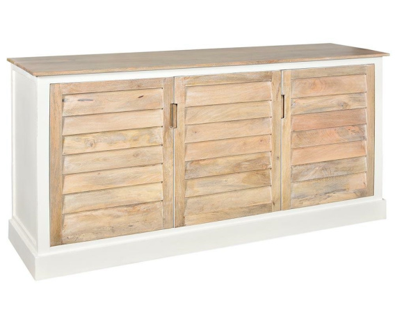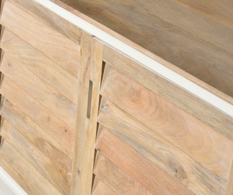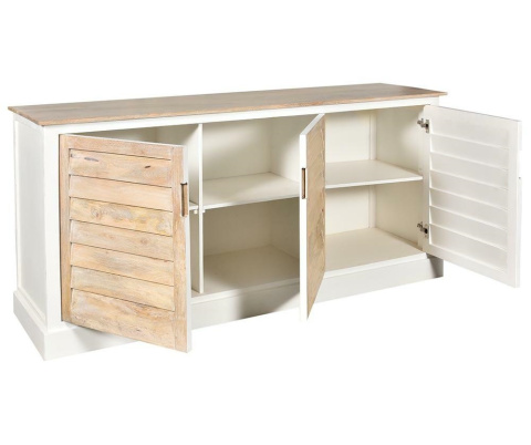 Ten niezwykły mebel zachwyca stylem, jakością wykonania i funkcjonalnością. Wysokiej klasy surowce, których użyto do produkcji komody sprawiają, że robi ona niezwykłe wrażenie. Jest dopracowana w każdym calu. Przepiękny odcień naturalnego drewna połączony z bielą, to ponadczasowe zestawienie, które pokocha każdy wielbiciel stylu prowansalskiego lub hampton. Mebel dedykowany jasnym, przestronnym wnętrzom. Odnajdzie się zarówno w salonie jak i słonecznej jadalni. Posiada trzy pojemne schowki z półkami ukryte za pięknymi frontami typu shutters. Komoda pomieści wiele przedmiotów i pozwoli Ci utrzymać nienaganny porządek w pięknie zaaranżowanej przestrzeni.