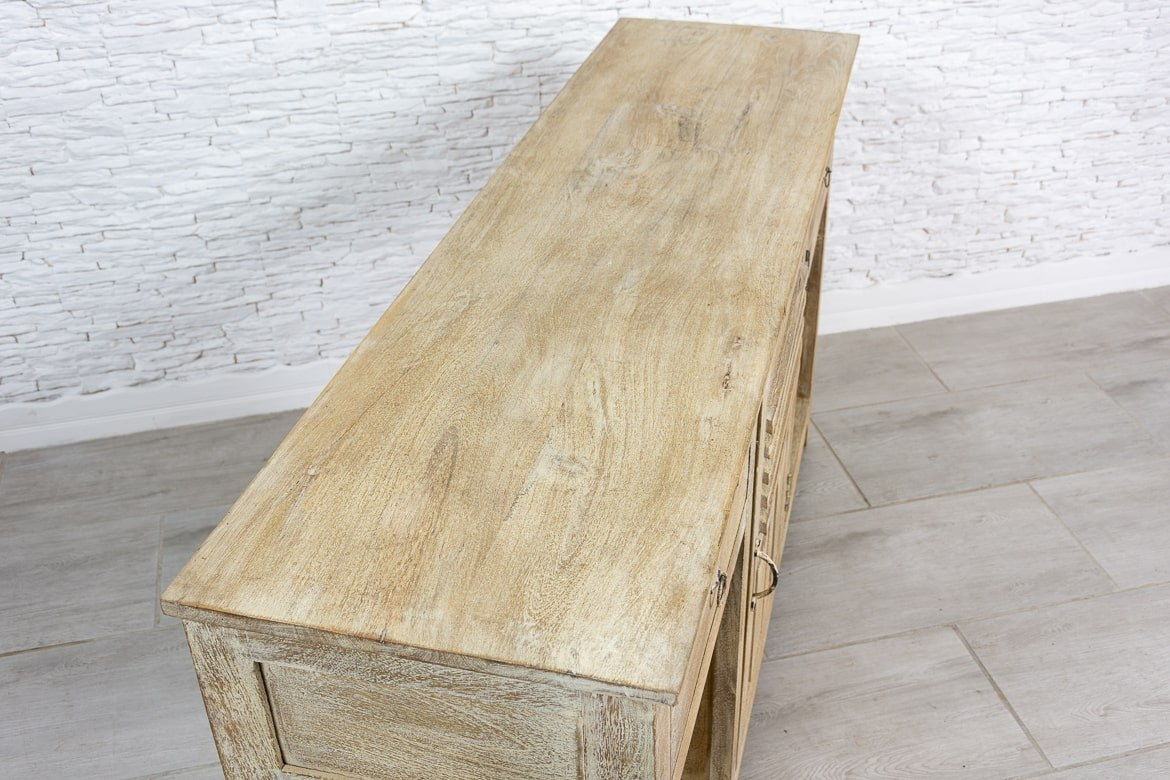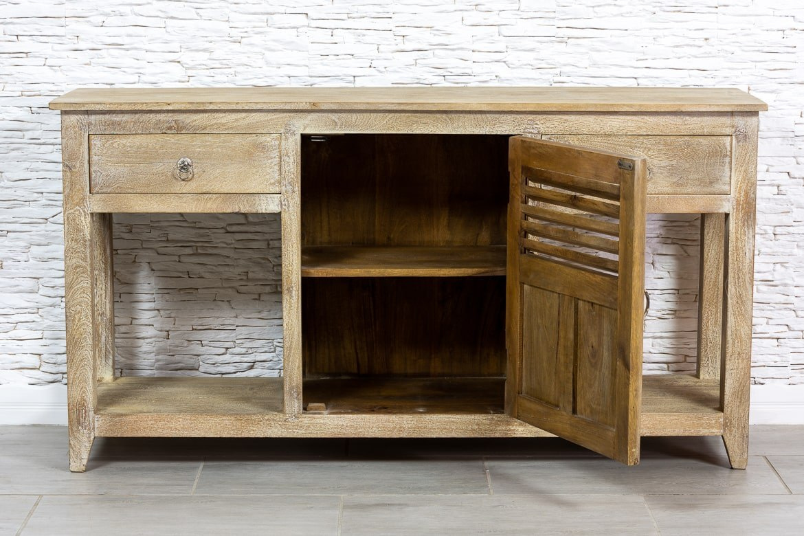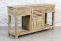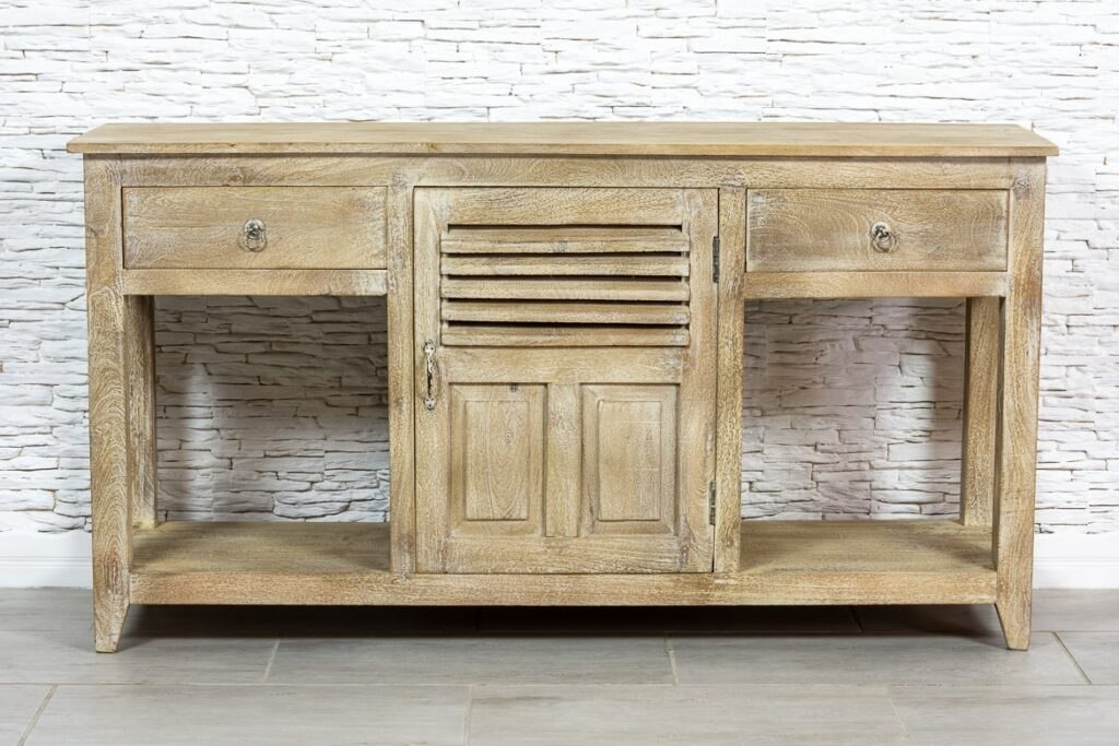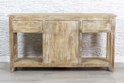 Szeroka konsola indyjska wykonana z piaskowanego, bielonego drewna mango. Mebel posiada dwie szuflady, i duży schowek, a także dwie otwarte półki. Jest to mebel idealny do przestronnej łazienki. Wspaniale sprawdzi się pod umywalką i zapewni dodatkową przestrzeń do przechowywania. Odnajdzie się także w salonie lub przedpokoju. Miejsce pod blatem idealnie wypełnią kwiaty lub ozdobne kosze. Dekoracyjny font stylizowany na stare drzwi nadaje całości charakteru vintage. Konsola o uniwersalnym designie, który z łatwością wpisze się w wiele stylizacji.