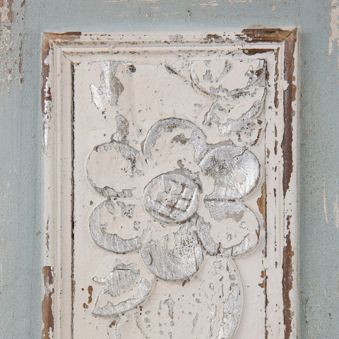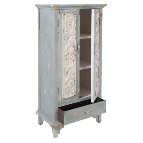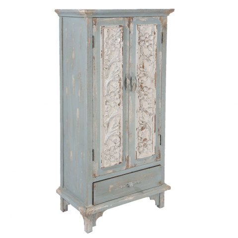 Szafa wykonana z drewna i specjalnie postarzona. Na powierzchni mebla widać spękania i odpryski farby, które szczególnie pięknie wplatają się w rzeźbiony roślinny motyw na frontach. Bielenie idealnie współgra z bladą, zgaszoną zielenią. Szafka posiada trzy półki i szufladę. Mebel uniwersalny, dla którego zastosowanie znajdziesz właściwie w każdym pomieszczeniu. Może być schowkiem na ubrania, naczynia, dokumenty czy pościel. Polecamy do nietuzinkowych wnętrz w przaśnym stylu.