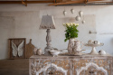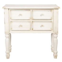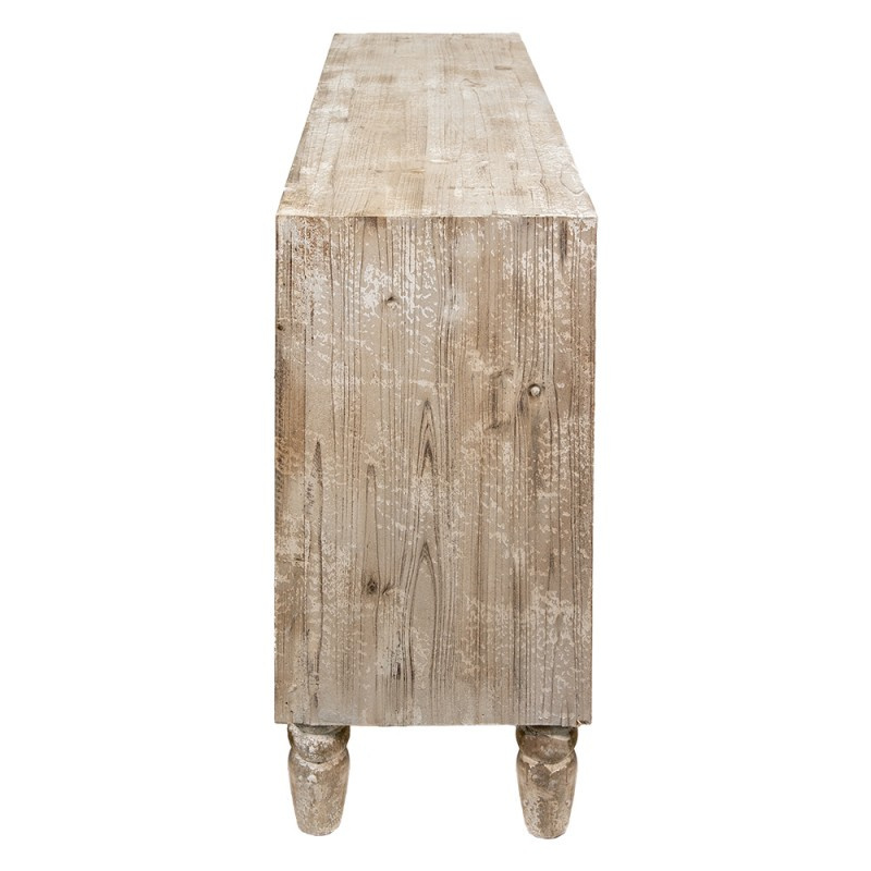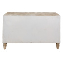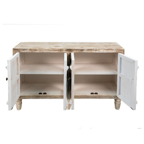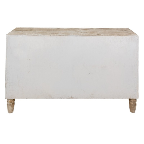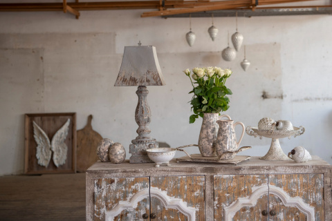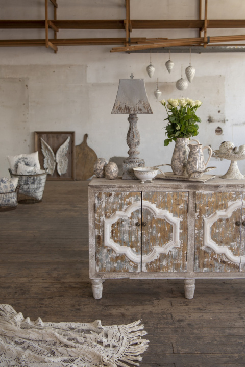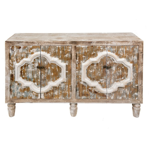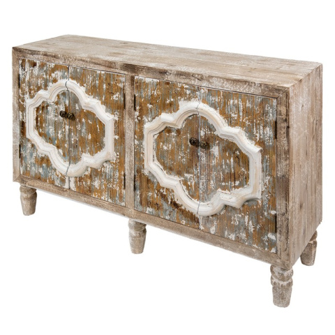 Przecierana, drewniana komoda country marki Clayre & Eef na toczonych nóżkach. Mebel w odcieniach szarości, bieli i brązów. Podwójne drzwiczki z wypukłymi dekorami, wyglądają jak odzyskane z autentycznego starego mebla. Komoda została w całości mocno postarzona. Sprawdzi się w każdym pomieszczeniu i doda mu wiele uroku. Ozdobi szczególnie klimatyczne aranżacje w stylu vintage, farmhouse czy country chic. Polecamy łączyć z meblami takimi jak: postarzany stół, drewniany regał czy rustykalny kredens.