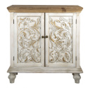 Mebel w kolorze antycznej bieli ze złoceniami na florystycznych rzeźbieniach. Frezowany blat w odcieniu naturalnego drewna bardzo ładnie komponuje się z delikatną całością. Komoda sprawdzi się w każdym pomieszczeniu.