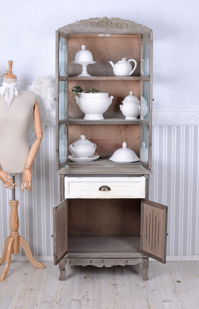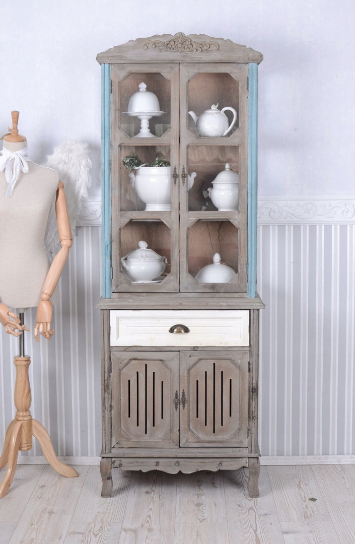 Mebel kształtem przypomina witrynę z dawnych lat, a jego postarzane wykończenie sprawia, że wygląda jak autentyczny przedmiot ze starego, wiejskiego domu. Piękne odcienie szarości, kremu i niebieskiego oraz zamierzone przetarcia sprawią, że poczujesz klimat prawdziwego rustykalu. Ta stylowa witryna jest meblem niezwykle urokliwym, a zarazem praktycznym. Posiada zamykany schowek, szufladę oraz przeszkloną szafkę.