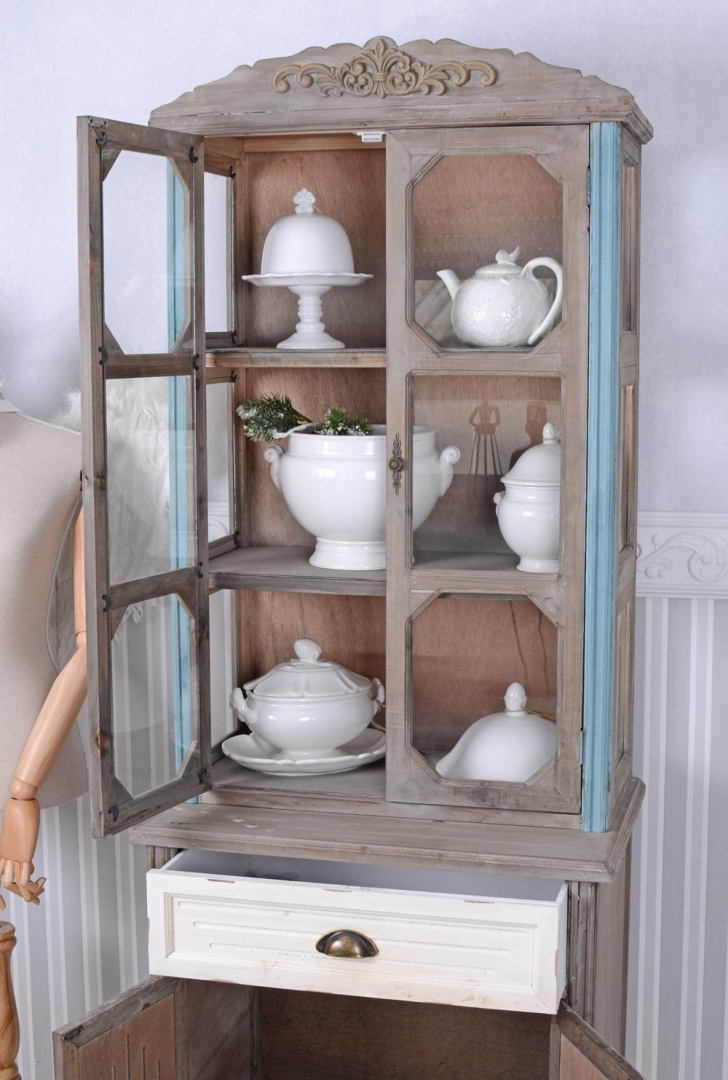 Witryna przepięknie zestawi się z meblami takimi jak: rustykalny stół, postarzana komoda, drewniana ławka, przecierane krzesła.