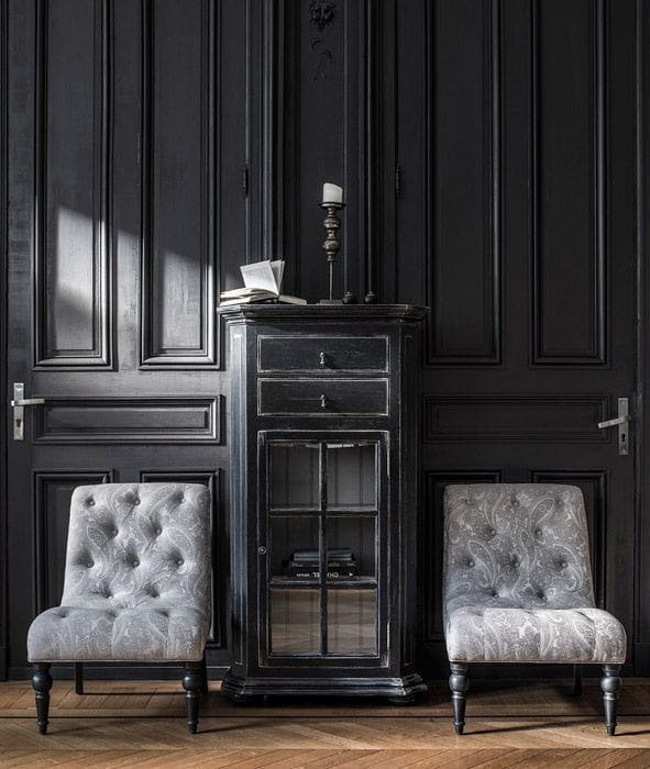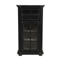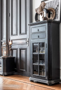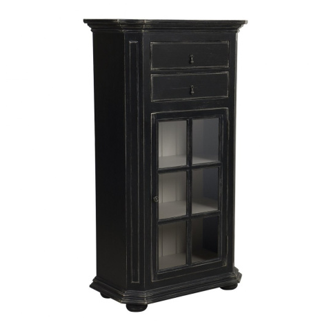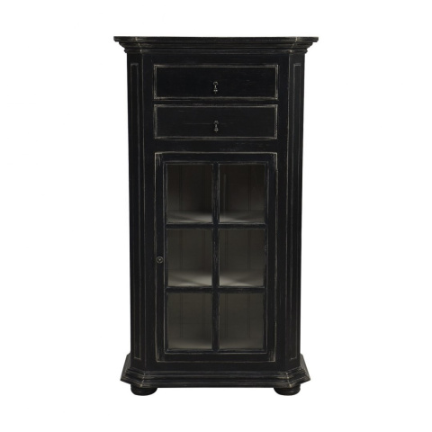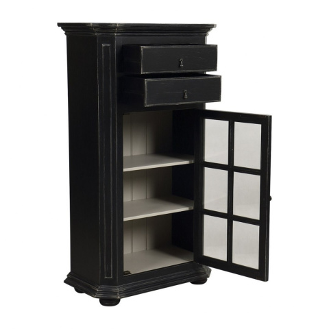 Czarna, postarzana szafka drewniana w stylu francuskim z kolekcji Bruges od Belldeco. Bardzo klasyczny kształt stylizowany na mebel z dawnej epoki. Szafka posiada dwie półki, za przeszklonymi frontami oraz dwie szuflady z metalowymi gałkami.