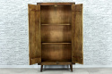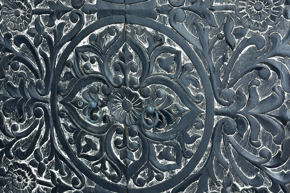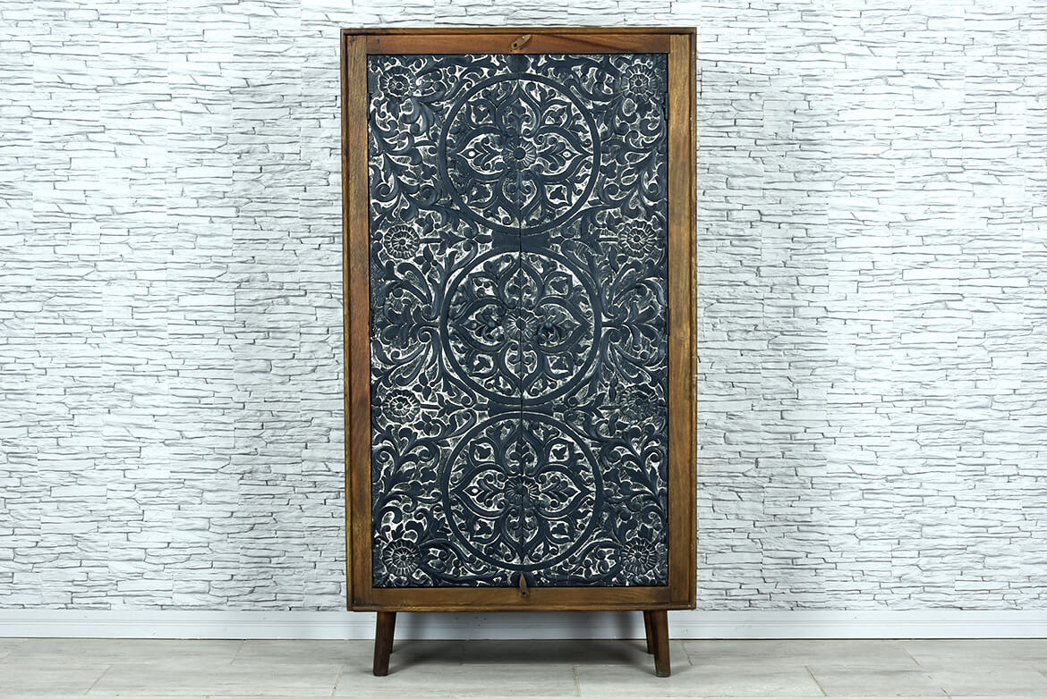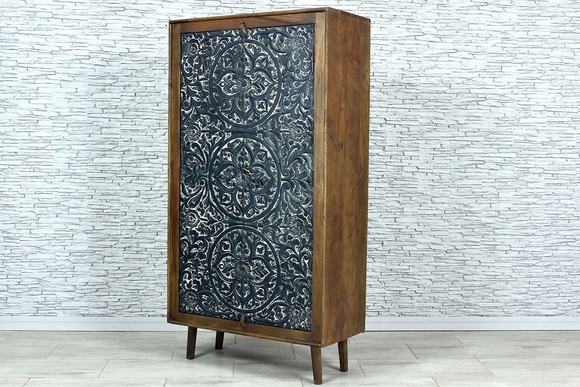 Drewniana szafa indyjska z ozdobnym frontem, na którym wyrzeźbiono zjawiskowe, florystyczne wzory i mandale.